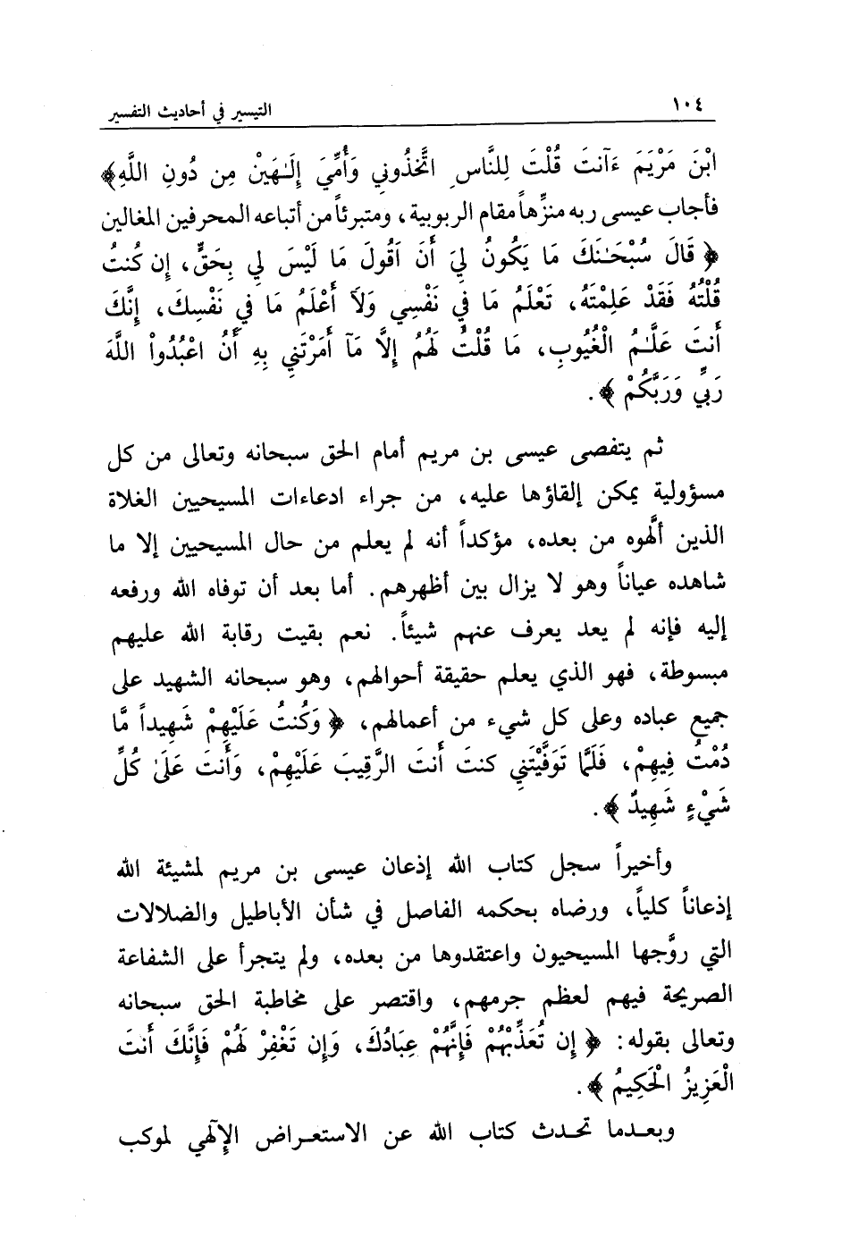 ثم يتفصى عيسى ابن مريم أمام الحق سبحانه وتعالى من كل مسؤولية يمكن إلقاؤها عليه من جراء ادعاءات المسيحيين إلا ما شاهده عيانا وهو لا يزال بين أظهرهم. أما بعد أن توفاه الله ورفعه إليه فإنه لم يعد يعرف عنهم شيئا. نعم بقيت رقابة الله عليهم مبسوطة، فهو الذي يعلم حقيقة أحوالهم، وهو سبحانه الشهيد على جميع عباده وعلى كل شيء من أعمالهم، {وَكُنْتُ عَلَيْهِمْ شَهِيدًا مَا دُمْتُ فِيهِمْ فَلَمَّا تَوَفَّيْتَنِي كُنْتَ أَنْتَ الرَّقِيبَ عَلَيْهِمْ وَأَنْتَ عَلَى كُلِّ شَيْءٍ شَهِيدٌ}.