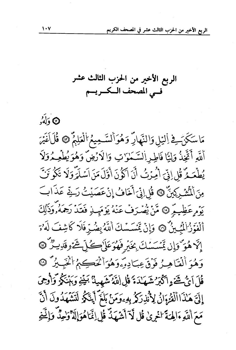وَلَهُ مَا سَكَنَ فِي اللَّيْلِ وَالنَّهَارِ وَهُوَ السَّمِيعُ الْعَلِيمُ (13) قُلْ أَغَيْرَ اللَّهِ أَتَّخِذُ وَلِيًّا فَاطِرِ السَّمَاوَاتِ وَالْأَرْضِ وَهُوَ يُطْعِمُ وَلَا يُطْعَمُ قُلْ إِنِّي أُمِرْتُ أَنْ أَكُونَ أَوَّلَ مَنْ أَسْلَمَ وَلَا تَكُونَنَّ مِنَ الْمُشْرِكِينَ (14) قُلْ إِنِّي أَخَافُ إِنْ عَصَيْتُ رَبِّي عَذَابَ يَوْمٍ عَظِيمٍ (15) مَنْ يُصْرَفْ عَنْهُ يَوْمَئِذٍ فَقَدْ رَحِمَهُ وَذَلِكَ الْفَوْزُ الْمُبِينُ (16) وَإِنْ يَمْسَسْكَ اللَّهُ بِضُرٍّ فَلَا كَاشِفَ لَهُ إِلَّا هُوَ وَإِنْ يَمْسَسْكَ بِخَيْرٍ فَهُوَ عَلَى كُلِّ شَيْءٍ قَدِيرٌ (17) وَهُوَ الْقَاهِرُ فَوْقَ عِبَادِهِ وَهُوَ الْحَكِيمُ الْخَبِيرُ (18) قُلْ أَيُّ شَيْءٍ أَكْبَرُ شَهَادَةً قُلِ اللَّهُ شَهِيدٌ بَيْنِي وَبَيْنَكُمْ وَأُوحِيَ إِلَيَّ هَذَا الْقُرْآنُ لِأُنْذِرَكُمْ بِهِ وَمَنْ بَلَغَ أَئِنَّكُمْ لَتَشْهَدُونَ أَنَّ مَعَ اللَّهِ آلِهَةً أُخْرَى قُلْ لَا أَشْهَدُ قُلْ إِنَّمَا هُوَ إِلَهٌ وَاحِدٌ وَإِنَّنِي