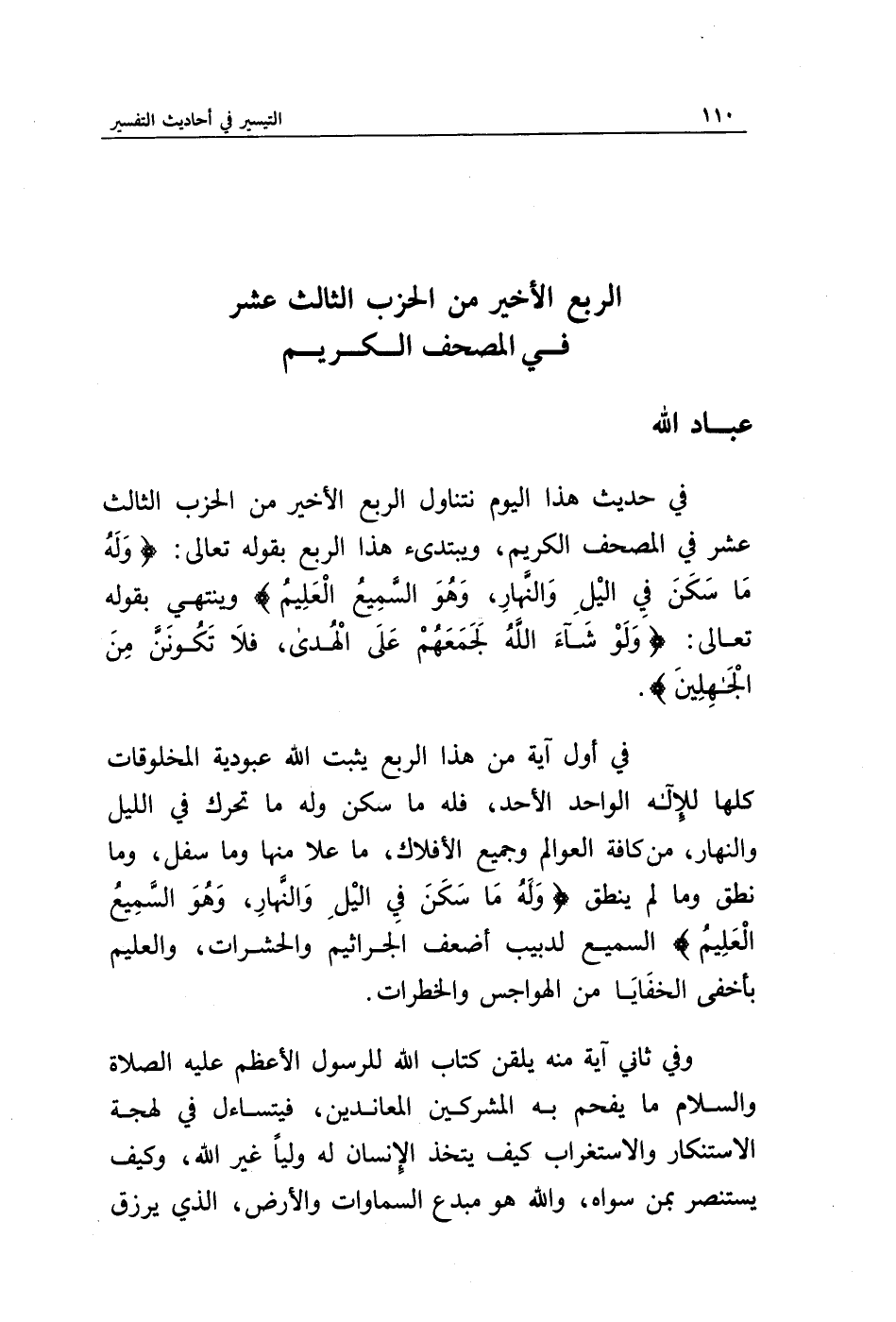 في حديث هذا اليوم نتناول الربع الأخير من الحزب الثالث عشر في المصحف الكريم، ويبتدىء هذا الربع بقوله تعالى: {وَلَهُ مَا سَكَنَ فِي اللَّيْلِ وَالنَّهَارِ وَهُوَ السَّمِيعُ الْعَلِيمُ} وينتهي بقوله تعالى: {وَلَوْ شَاءَ اللَّهُ لَجَمَعَهُمْ عَلَى الْهُدَى فَلَا تَكُونَنَّ مِنَ الْجَاهِلِينَ}