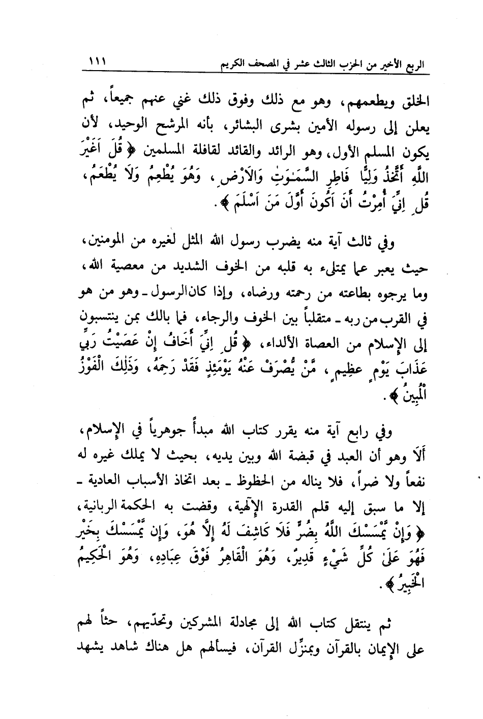 وفي رابع آية منه يقرر كتاب الله مبدأ جوهريا في الإسلام، ألا وهو أن العبد في قبضة الله وبين يديه، بحيث لا يملك غيره له نفعا ولا ضرا، فلا يناله من الحظوظ - بعد اتخاذ الأساليب العادية - إلا ما سبق إليه قلم القدرة الإلهية، وقضت به الحكمة الربانية، {وَإِنْ يَمْسَسْكَ بِخَيْرٍ فَهُوَ عَلَى كُلِّ شَيْءٍ قَدِيرٌ * وَهُوَ الْقَاهِرُ فَوْقَ عِبَادِهِ وَهُوَ الْحَكِيمُ الْخَبِيرُ}.