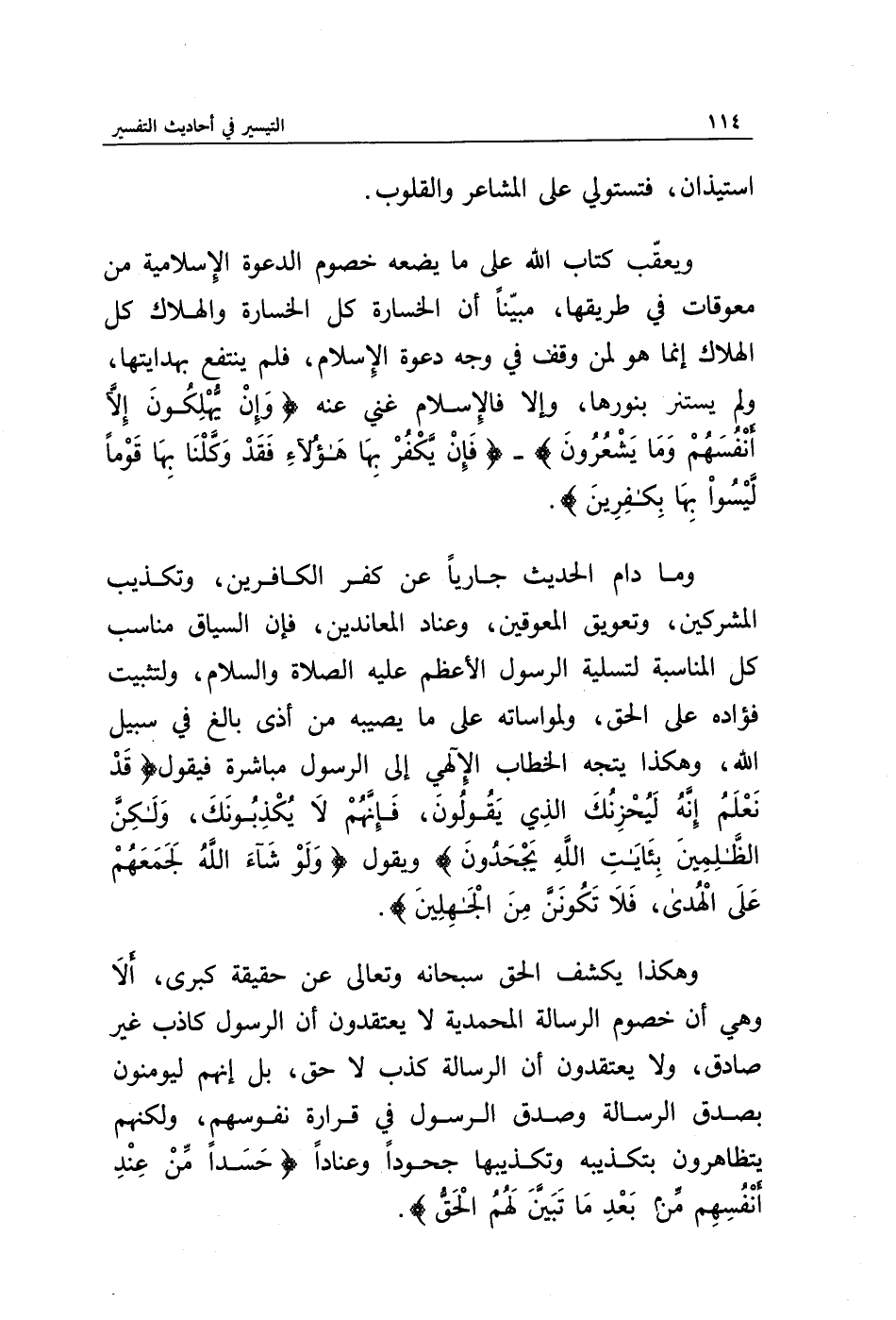 وما دام الحديث جاريا عن كفر الكافرين، وتكذيب المشركين، وتعويق المعوقين، وعناد المعاندين، فإن السياق مناسب كل المناسبة لتسلية الرسول صلى الله عليه وسلم، ولتثبيت فؤاده على الحق، ولمواساته على ما يصيبه من أذى بالغ في سبيل الله، وهكذا يتجه الخطاب الإلهي إلى الرسول صلى الله عليه وسلم مباشرة فيقول {قَدْ نَعْلَمُ إِنَّهُ لَيَحْزُنُكَ الَّذِي يَقُولُونَ فَإِنَّهُمْ لَا يُكَذِّبُونَكَ وَلَكِنَّ الظَّالِمِينَ بِآيَاتِ اللَّهِ يَجْحَدُونَ} ويقول {وَلَوْ شَاءَ اللَّهُ لَجَمَعَهُمْ عَلَى الْهُدَى فَلَا تَكُونَنَّ مِنَ الْجَاهِلِينَ}.