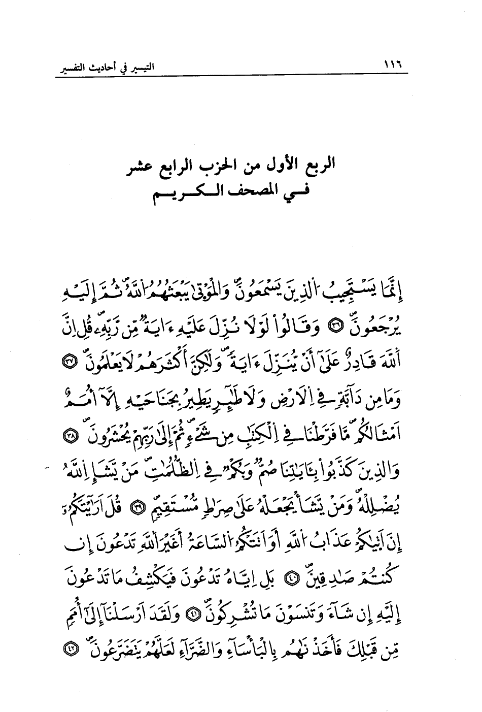 إِنَّمَا يَسْتَجِيبُ الَّذِينَ يَسْمَعُونَ وَالْمَوْتَى يَبْعَثُهُمُ اللَّهُ ثُمَّ إِلَيْهِ يُرْجَعُونَ (36) وَقَالُوا لَوْلَا نُزِّلَ عَلَيْهِ آيَةٌ مِنْ رَبِّهِ قُلْ إِنَّ اللَّهَ قَادِرٌ عَلَى أَنْ يُنَزِّلَ آيَةً وَلَكِنَّ أَكْثَرَهُمْ لَا يَعْلَمُونَ (37) وَمَا مِنْ دَابَّةٍ فِي الْأَرْضِ وَلَا طَائِرٍ يَطِيرُ بِجَنَاحَيْهِ إِلَّا أُمَمٌ أَمْثَالُكُمْ مَا فَرَّطْنَا فِي الْكِتَابِ مِنْ شَيْءٍ ثُمَّ إِلَى رَبِّهِمْ يُحْشَرُونَ (38) وَالَّذِينَ كَذَّبُوا بِآيَاتِنَا صُمٌّ وَبُكْمٌ فِي الظُّلُمَاتِ مَنْ يَشَإِ اللَّهُ يُضْلِلْهُ وَمَنْ يَشَأْ يَجْعَلْهُ عَلَى صِرَاطٍ مُسْتَقِيمٍ (39) قُلْ أَرَأَيْتَكُمْ إِنْ أَتَاكُمْ عَذَابُ اللَّهِ أَوْ أَتَتْكُمُ السَّاعَةُ أَغَيْرَ اللَّهِ تَدْعُونَ إِنْ كُنْتُمْ صَادِقِينَ (40) بَلْ إِيَّاهُ تَدْعُونَ فَيَكْشِفُ مَا تَدْعُونَ إِلَيْهِ إِنْ شَاءَ وَتَنْسَوْنَ مَا تُشْرِكُونَ (41) وَلَقَدْ أَرْسَلْنَا إِلَى أُمَمٍ مِنْ قَبْلِكَ فَأَخَذْنَاهُمْ بِالْبَأْسَاءِ وَالضَّرَّاءِ لَعَلَّهُمْ يَتَضَرَّعُونَ (42)