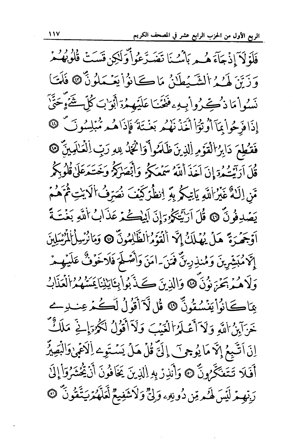 فَلَوْلَا إِذْ جَاءَهُمْ بَأْسُنَا تَضَرَّعُوا وَلَكِنْ قَسَتْ قُلُوبُهُمْ وَزَيَّنَ لَهُمُ الشَّيْطَانُ مَا كَانُوا يَعْمَلُونَ (43) فَلَمَّا نَسُوا مَا ذُكِّرُوا بِهِ فَتَحْنَا عَلَيْهِمْ أَبْوَابَ كُلِّ شَيْءٍ حَتَّى إِذَا فَرِحُوا بِمَا أُوتُوا أَخَذْنَاهُمْ بَغْتَةً فَإِذَا هُمْ مُبْلِسُونَ (44) فَقُطِعَ دَابِرُ الْقَوْمِ الَّذِينَ ظَلَمُوا وَالْحَمْدُ لِلَّهِ رَبِّ الْعَالَمِينَ (45) قُلْ أَرَأَيْتُمْ إِنْ أَخَذَ اللَّهُ سَمْعَكُمْ وَأَبْصَارَكُمْ وَخَتَمَ عَلَى قُلُوبِكُمْ مَنْ إِلَهٌ غَيْرُ اللَّهِ يَأْتِيكُمْ بِهِ انْظُرْ كَيْفَ نُصَرِّفُ الْآيَاتِ ثُمَّ هُمْ يَصْدِفُونَ (46) قُلْ أَرَأَيْتَكُمْ إِنْ أَتَاكُمْ عَذَابُ اللَّهِ بَغْتَةً أَوْ جَهْرَةً هَلْ يُهْلَكُ إِلَّا الْقَوْمُ الظَّالِمُونَ (47) وَمَا نُرْسِلُ الْمُرْسَلِينَ إِلَّا مُبَشِّرِينَ وَمُنْذِرِينَ فَمَنْ آمَنَ وَأَصْلَحَ فَلَا خَوْفٌ عَلَيْهِمْ وَلَا هُمْ يَحْزَنُونَ (48) وَالَّذِينَ كَذَّبُوا بِآيَاتِنَا يَمَسُّهُمُ الْعَذَابُ بِمَا كَانُوا يَفْسُقُونَ (49) قُلْ لَا أَقُولُ لَكُمْ عِنْدِي خَزَائِنُ اللَّهِ وَلَا أَعْلَمُ الْغَيْبَ وَلَا أَقُولُ لَكُمْ إِنِّي مَلَكٌ إِنْ أَتَّبِعُ إِلَّا مَا يُوحَى إِلَيَّ قُلْ هَلْ يَسْتَوِي الْأَعْمَى وَالْبَصِيرُ أَفَلَا تَتَفَكَّرُونَ (50) وَأَنْذِرْ بِهِ الَّذِينَ يَخَافُونَ أَنْ يُحْشَرُوا إِلَى رَبِّهِمْ لَيْسَ لَهُمْ مِنْ دُونِهِ وَلِيٌّ وَلَا شَفِيعٌ لَعَلَّهُمْ يَتَّقُونَ (51)