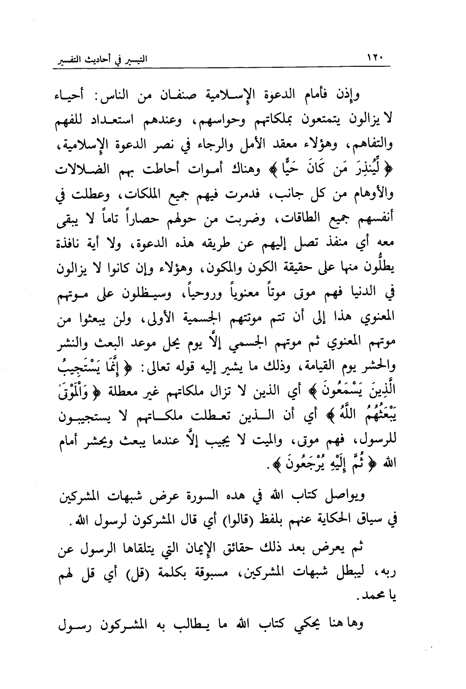 وإذن فأمام الدعوة الإسلامية صنفان من الناس، أحياء لا يزالون يتمتعون بملكاتهم وحواسهم، وعندهم استعداد للفهم والتفاهم، وهؤلاء معقد الأمل والرجاء في نصر الدعوة الإسلامية، {لِيُنْذِرَ مَنْ كَانَ حَيًّا} وهناك أموات أحاطت بهم الضلالات والأوهام من كل جانب، فدمرت فيهم جميع الملكات، وعطلت في أنفسهم جميع الطاقات، وضربت من حولهم حصارا تاما لا يبقى معه أي منفذ تصل إليهم عن طريقه هذه الدعوة، ولا أية نافذة يطلون منها على حقيقة الكون والمكون، وهؤلاء وإن كانوا لا يزالون في الدنيا فهم موتى موتا معنويا وروحيا، وسيظلون على موتهم المعنوي هذا إلى أن تتم موتتهم الجسمية الأولى، ولن يبعثوا من موتهم المعنوي ثم موتهم الجسمي إلا يوم يحل موعد البعث والنشر والحشر يوم القيامة، وذلك ما يشير إليه قوله تعالى: {إِنَّمَا يَسْتَجِيبُ الَّذِينَ يَسْمَعُونَ} أي الذين لا تزال ملكاتهم غير معطلة {وَالْمَوْتَى يَبْعَثُهُمُ اللَّهُ} أي الذين تعطلت ملكاتهم لا يستجيبون للرسول صلى الله عليه وسلم، فهم موتى، والميت لا يجيب إلا عندما يبعث ويحشر أمام الله {ثُمَّ إِلَيْهِ تُرْجَعُونَ}.
