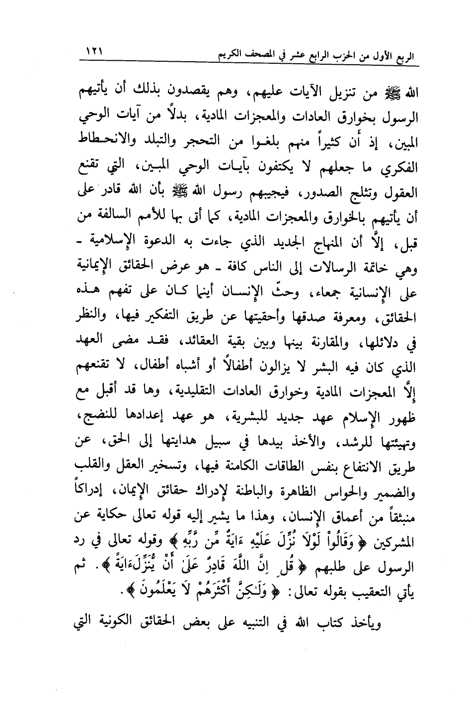 الله صلى الله عليه وسلم من تنزيل الآيات عليهم، وهم يقصدون بذلك أن يأتيهم الرسول صلى الله عليه وسلم بخوارق العادات والمعجزات المادية، بدلا من آيات الوحي المبين، إذ إن كثيرا منهم بلغوا من التحجر والتبلد والانحطاط الفكري ما جعلهم لا يكتفون بآيات الوحي المبين، التي تقنع العقول وتثلج الصدور، فيجيبهم رسول الله صلى الله عليه وسلم بأن الله قادر على أن يأتيهم بالخوارق والمعجزات المادية، كما أتى بها للأمم السالفة من قبل، إلا أن المنهاج الجديد الذي جاءت به الدعوة الإسلامية - وهو خاتمة الرسالات إلى الناس كافة - هو عرض الحقائق الإيمانية على الإنسانية جمعاء، وحث الإنسان أينما كان على تفهم هذه الحقائق، ومعرفة صدقها وأحقيتها عن طريق التفكير بها، والنظر في دلائلها، والمقارنة بينها وبين بقية العقائد، فقد مضى العهد الذي كان فيه البشر لا يزالون أطفالا أو أشباه أطفال لا تقنعهم إلا المعجزات المادية وخوارق العادات التقليدية، وها قد أقبل مع ظهور الإسلام عهد جديد للبشرية، هو عهد إعدادها للنضج، وتهيئتها للرشد، والأخذ بيدها في سبيل هدايتها إلى الحق، عن طريق الانتفاع بنفس الطاقات الكامنة فيها، وتسخير العقل والقلب والضمير والحواس الظاهرة والباطنة لإدراك حقائق الإيمان، إدراكا منبثقا من أعماق الإنسان، وهذا ما يشير إليه قوله تعالى حكاية عن المشركين {وَقَالُوا لَوْلَا نُزِّلَ عَلَيْهِ آيَةٌ مِنْ رَبِّهِ} وقوله تعالى في رد الرسول صلى الله عليه وسلم على طلبهم {قُلْ إِنَّ اللَّهَ قَادِرٌ عَلَى أَنْ يُنَزِّلَ آيَةً}. ثم يأتي التعقيب بقوله تعالى: {وَلَكِنَّ أَكْثَرَهُمْ لَا يَعْلَمُونَ}.