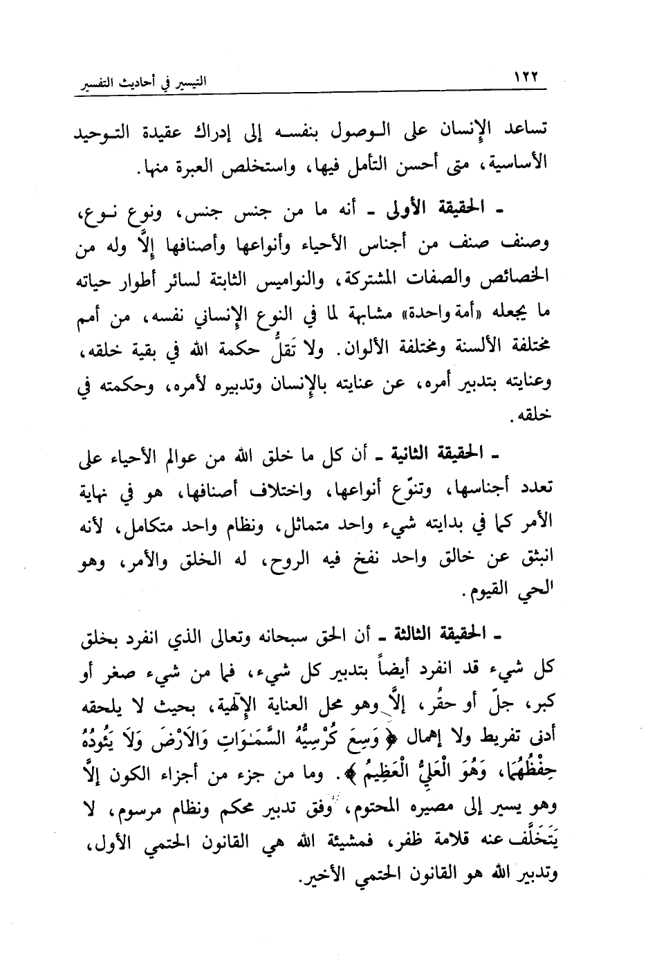 - الحقيقة الأولى- أنه ما من جنس جنس، ونوع نوع، وصنف صنف من أجناس الأحياء وأنواعها وأصنافها إلا وله من الخصائص والصفات المشتركة، والنواميس الثابتة لسائر أطوار حياته ما يجعله {أمة واحدة} مشابهة لما في النوع الإنساني نفسه، من أمم مختلفة الألسنة ومختلفة الألوان. ولا تقل حكمة الله في بقية خلقه، وعنايته بتدبير أمره، عن عنايته بالإنسان وتدبيره لأمره، وحكمته في خلقه.