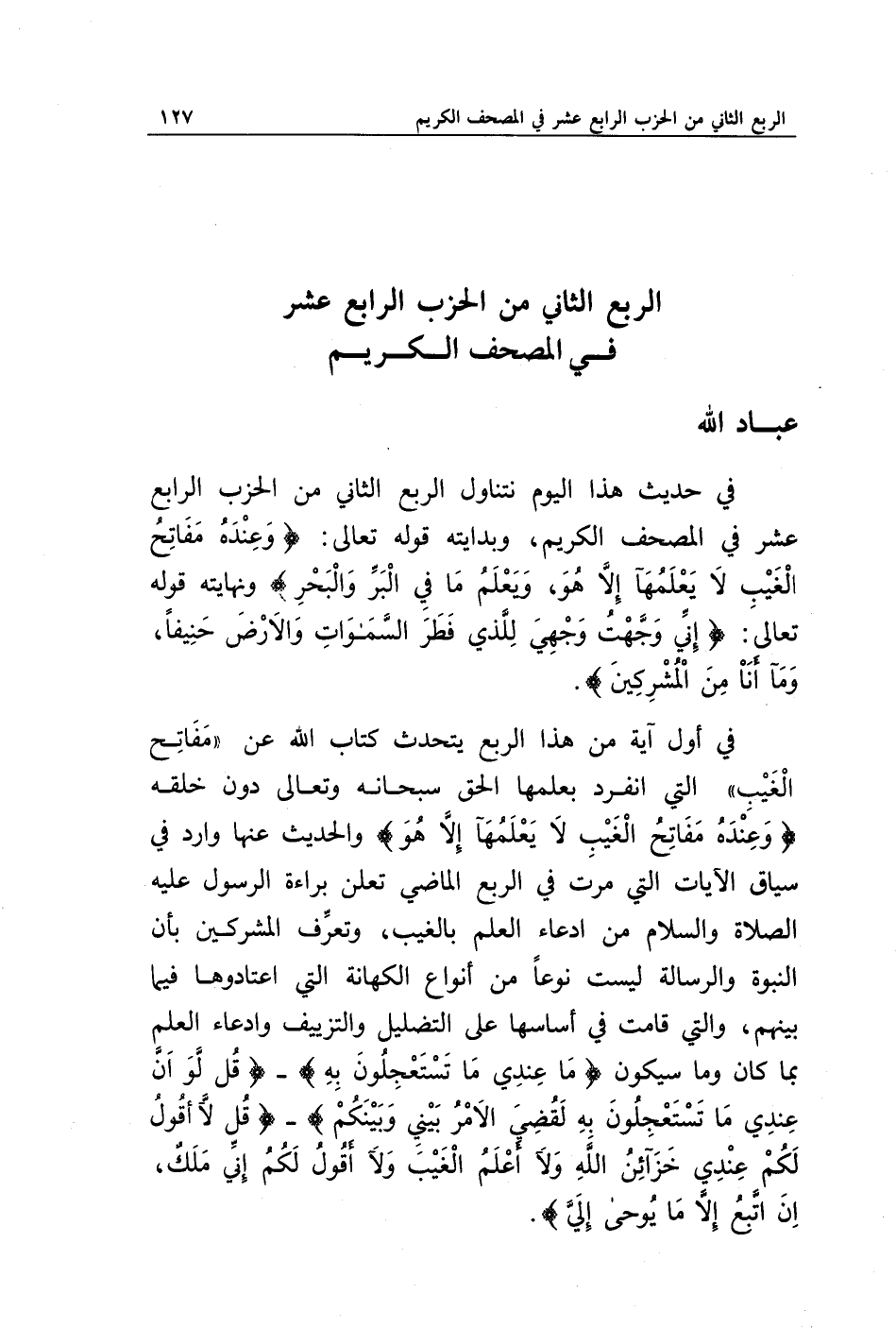 في حديث هذا اليوم نتناول الربع الثاني من الحزب الرابع عشر في المصحف الكريم، وبدايته قوله تعالى: {وَعِنْدَهُ مَفَاتِحُ الْغَيْبِ لَا يَعْلَمُهَا إِلَّا هُوَ وَيَعْلَمُ مَا فِي الْبَرِّ وَالْبَحْرِ} ونهايته قوله تعالى: {إِنِّي وَجَّهْتُ وَجْهِيَ لِلَّذِي فَطَرَ السَّمَاوَاتِ وَالْأَرْضَ حَنِيفًا وَمَا أَنَا مِنَ الْمُشْرِكِينَ}