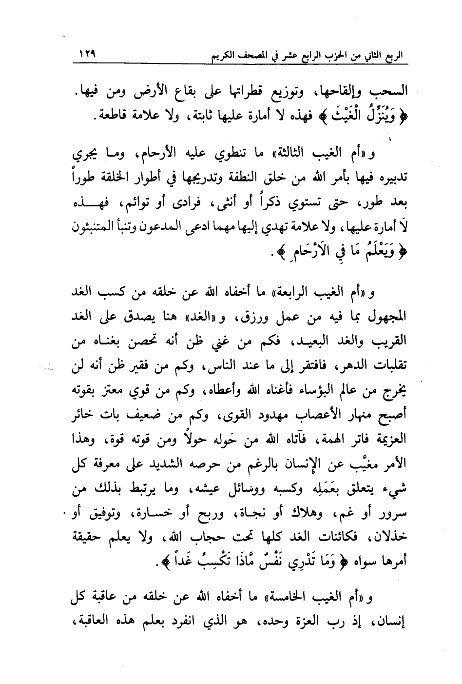 و" أم الغيب الرابعة " ما أخفاه الله عن خلقه من كسب الغد المجهول بما فيه من عمل ورزق، و " الغد " هنا يصدق على الغد القريب والغد البعيد، فكم من غني ظن أنه تحصن بغناه من تقلبات الدهر، فافتقر إلى ما عند الناس، وكم من فقير ظن أنه لن يخرج من عالم البؤساء فأغناه الله وأعطاه، وكم من قوي معتز بقوته أصبح منهار الأعصاب مهدود القوى، وكم من ضعيف بات خائر العزيمة فاتر الهمة، فآتاه لله من حوله حولا ومن قوته قوة، وهذا الأمر مغيب عن الإنسان بالرغم من حرصه الشديد على معرفة كل شيء يتعلق بعمله وكسبه ووسائل عيشه، وما يرتبط بذلك من سرور أو غم، وهلاك أو نجاة، وربح أو خسارة وتوفيق أو خذلان، فكائنات الغد كلها تحت حجاب الله، ولا يعلم حقيقة أمرها سواه {وَمَا تَدْرِي نَفْسٌ مَاذَا تَكْسِبُ غَدًا}.