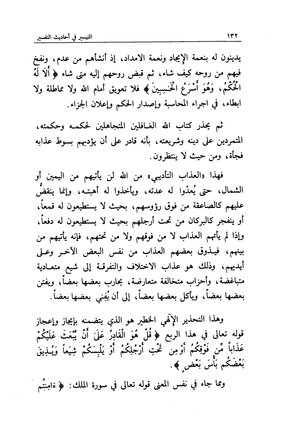 وهذا التحذير الإلهي الخطير هو الذي يتضمنه بإيجاز وإعجاز قوله تعالى في هذا الربع {قُلْ هُوَ الْقَادِرُ عَلَى أَنْ يَبْعَثَ عَلَيْكُمْ عَذَابًا مِنْ فَوْقِكُمْ أَوْ مِنْ تَحْتِ أَرْجُلِكُمْ أَوْ يَلْبِسَكُمْ شِيَعًا وَيُذِيقَ بَعْضَكُمْ بَأْسَ بَعْضٍ}.