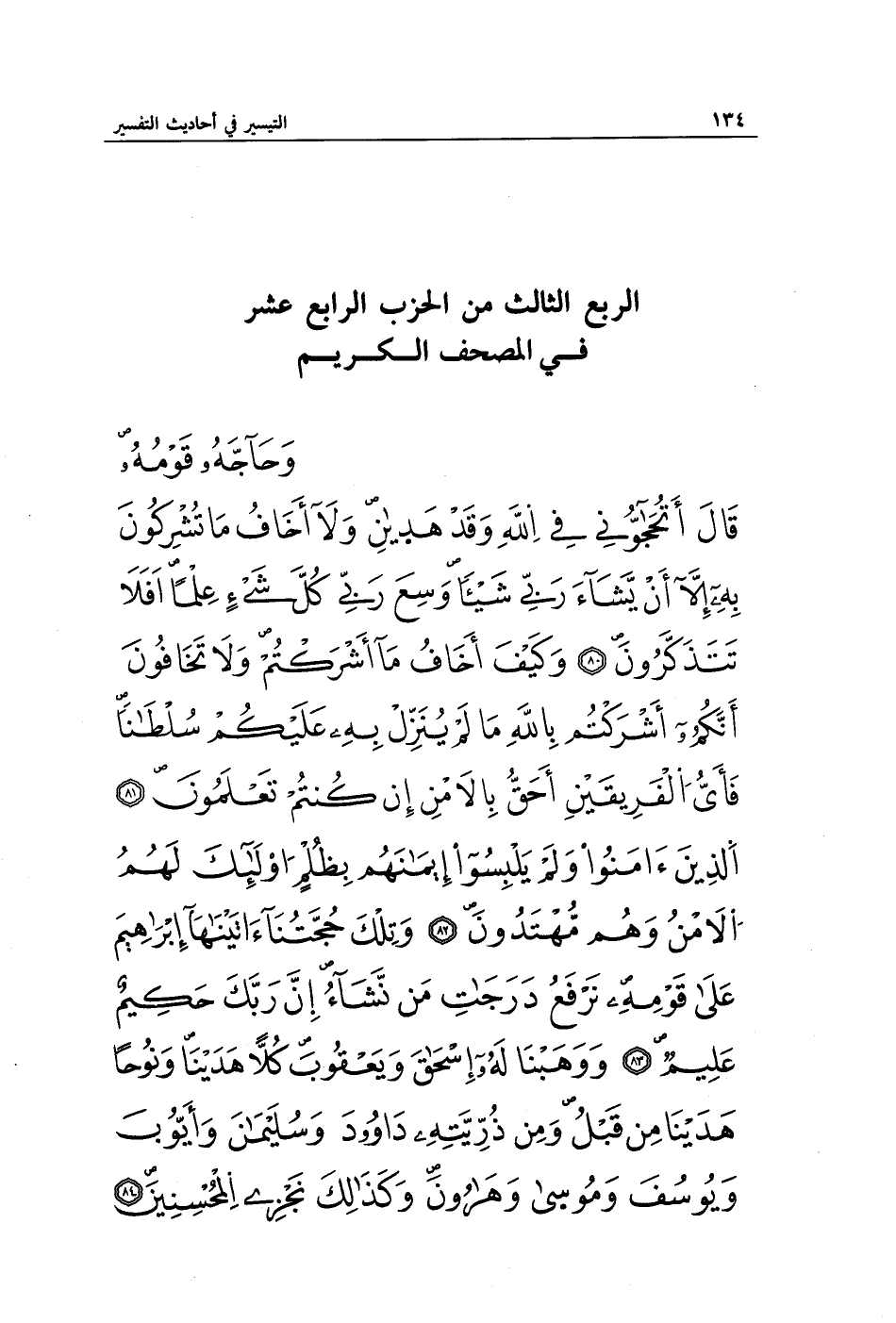 وَحَاجَّهُ قَوْمُهُ قَالَ أَتُحَاجُّونِّي فِي اللَّهِ وَقَدْ هَدَانِ وَلَا أَخَافُ مَا تُشْرِكُونَ بِهِ إِلَّا أَنْ يَشَاءَ رَبِّي شَيْئًا وَسِعَ رَبِّي كُلَّ شَيْءٍ عِلْمًا أَفَلَا تَتَذَكَّرُونَ (80) وَكَيْفَ أَخَافُ مَا أَشْرَكْتُمْ وَلَا تَخَافُونَ أَنَّكُمْ أَشْرَكْتُمْ بِاللَّهِ مَا لَمْ يُنَزِّلْ بِهِ عَلَيْكُمْ سُلْطَانًا فَأَيُّ الْفَرِيقَيْنِ أَحَقُّ بِالْأَمْنِ إِنْ كُنْتُمْ تَعْلَمُونَ (81) الَّذِينَ آمَنُوا وَلَمْ يَلْبِسُوا إِيمَانَهُمْ بِظُلْمٍ أُولَئِكَ لَهُمُ الْأَمْنُ وَهُمْ مُهْتَدُونَ (82) وَتِلْكَ حُجَّتُنَا آتَيْنَاهَا إِبْرَاهِيمَ عَلَى قَوْمِهِ نَرْفَعُ دَرَجَاتٍ مَنْ نَشَاءُ إِنَّ رَبَّكَ حَكِيمٌ عَلِيمٌ (83) وَوَهَبْنَا لَهُ إِسْحَاقَ وَيَعْقُوبَ كُلًّا هَدَيْنَا وَنُوحًا هَدَيْنَا مِنْ قَبْلُ وَمِنْ ذُرِّيَّتِهِ دَاوُودَ وَسُلَيْمَانَ وَأَيُّوبَ وَيُوسُفَ وَمُوسَى وَهَارُونَ وَكَذَلِكَ نَجْزِي الْمُحْسِنِينَ (84)