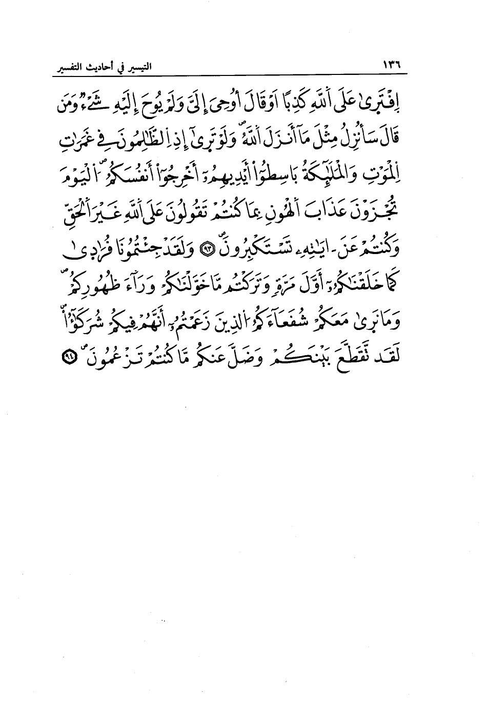 افْتَرَى عَلَى اللَّهِ كَذِبًا أَوْ قَالَ أُوحِيَ إِلَيَّ وَلَمْ يُوحَ إِلَيْهِ شَيْءٌ وَمَنْ قَالَ سَأُنْزِلُ مِثْلَ مَا أَنْزَلَ اللَّهُ وَلَوْ تَرَى إِذِ الظَّالِمُونَ فِي غَمَرَاتِ الْمَوْتِ وَالْمَلَائِكَةُ بَاسِطُو أَيْدِيهِمْ أَخْرِجُوا أَنْفُسَكُمُ الْيَوْمَ تُجْزَوْنَ عَذَابَ الْهُونِ بِمَا كُنْتُمْ تَقُولُونَ عَلَى اللَّهِ غَيْرَ الْحَقِّ وَكُنْتُمْ عَنْ آيَاتِهِ تَسْتَكْبِرُونَ (93) وَلَقَدْ جِئْتُمُونَا فُرَادَى كَمَا خَلَقْنَاكُمْ أَوَّلَ مَرَّةٍ وَتَرَكْتُمْ مَا خَوَّلْنَاكُمْ وَرَاءَ ظُهُورِكُمْ وَمَا نَرَى مَعَكُمْ شُفَعَاءَكُمُ الَّذِينَ زَعَمْتُمْ أَنَّهُمْ فِيكُمْ شُرَكَاءُ لَقَدْ تَقَطَّعَ بَيْنَكُمْ وَضَلَّ عَنْكُمْ مَا كُنْتُمْ تَزْعُمُونَ (94)