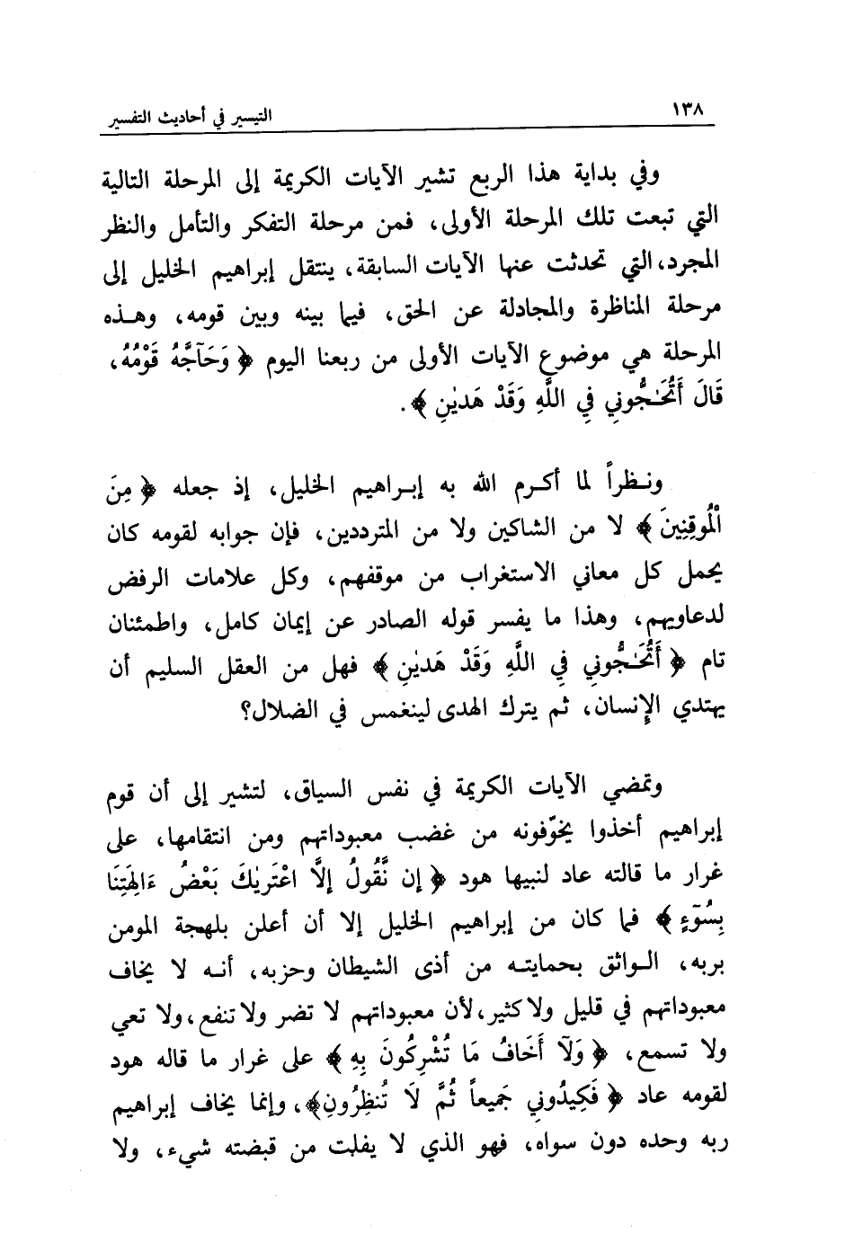 وفي بداية هذا الربع، تشير الآيات الكريمة إلى المرحلة التالية التي تبعت تلك المرحلة الأولى، فمن مرحلة التفكر والتأمل والنظر المجرد، التي تحدثت عنها الآيات السابقة، ينتقل إبراهيم الخليل إلى مرحلة المناظرة والمجادلة عن الحق، فيما بينه وبين قومه، وهذه المرحلة هي موضوع الآيات الأولى من ربعنا اليوم {وَحَاجَّهُ قَوْمُهُ قَالَ أَتُحَاجُّونِّي فِي اللَّهِ وَقَدْ هَدَانِ}.