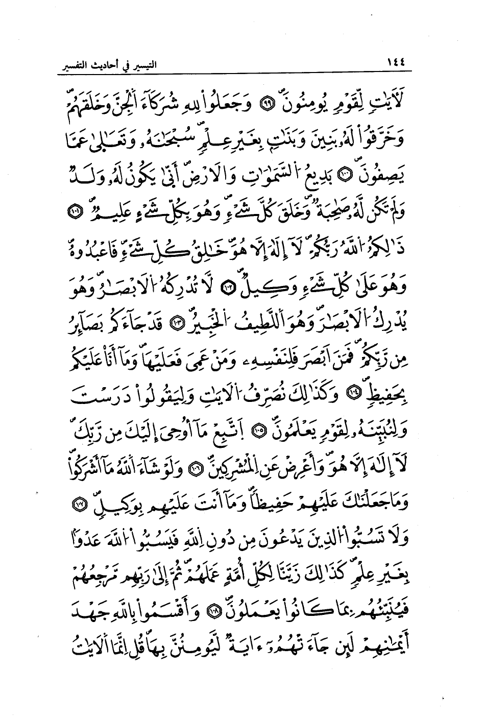 لَآيَاتٍ لِقَوْمٍ يُؤْمِنُونَ (99) وَجَعَلُوا لِلَّهِ شُرَكَاءَ الْجِنَّ وَخَلَقَهُمْ وَخَرَقُوا لَهُ بَنِينَ وَبَنَاتٍ بِغَيْرِ عِلْمٍ سُبْحَانَهُ وَتَعَالَى عَمَّا يَصِفُونَ (100) بَدِيعُ السَّمَاوَاتِ وَالْأَرْضِ أَنَّى يَكُونُ لَهُ وَلَدٌ وَلَمْ تَكُنْ لَهُ صَاحِبَةٌ وَخَلَقَ كُلَّ شَيْءٍ وَهُوَ بِكُلِّ شَيْءٍ عَلِيمٌ (101) ذَلِكُمُ اللَّهُ رَبُّكُمْ لَا إِلَهَ إِلَّا هُوَ خَالِقُ كُلِّ شَيْءٍ فَاعْبُدُوهُ وَهُوَ عَلَى كُلِّ شَيْءٍ وَكِيلٌ (102) لَا تُدْرِكُهُ الْأَبْصَارُ وَهُوَ يُدْرِكُ الْأَبْصَارَ وَهُوَ اللَّطِيفُ الْخَبِيرُ (103) قَدْ جَاءَكُمْ بَصَائِرُ مِنْ رَبِّكُمْ فَمَنْ أَبْصَرَ فَلِنَفْسِهِ وَمَنْ عَمِيَ فَعَلَيْهَا وَمَا أَنَا عَلَيْكُمْ بِحَفِيظٍ (104) وَكَذَلِكَ نُصَرِّفُ الْآيَاتِ وَلِيَقُولُوا دَرَسْتَ وَلِنُبَيِّنَهُ لِقَوْمٍ يَعْلَمُونَ (105) اتَّبِعْ مَا أُوحِيَ إِلَيْكَ مِنْ رَبِّكَ لَا إِلَهَ إِلَّا هُوَ وَأَعْرِضْ عَنِ الْمُشْرِكِينَ (106) وَلَوْ شَاءَ اللَّهُ مَا أَشْرَكُوا وَمَا جَعَلْنَاكَ عَلَيْهِمْ حَفِيظًا وَمَا أَنْتَ عَلَيْهِمْ بِوَكِيلٍ (107) وَلَا تَسُبُّوا الَّذِينَ يَدْعُونَ مِنْ دُونِ اللَّهِ فَيَسُبُّوا اللَّهَ عَدْوًا بِغَيْرِ عِلْمٍ كَذَلِكَ زَيَّنَّا لِكُلِّ أُمَّةٍ عَمَلَهُمْ ثُمَّ إِلَى رَبِّهِمْ مَرْجِعُهُمْ فَيُنَبِّئُهُمْ بِمَا كَانُوا يَعْمَلُونَ (108) وَأَقْسَمُوا بِاللَّهِ جَهْدَ أَيْمَانِهِمْ لَئِنْ جَاءَتْهُمْ آيَةٌ لَيُؤْمِنُنَّ بِهَا قُلْ إِنَّمَا الْآيَاتُ
