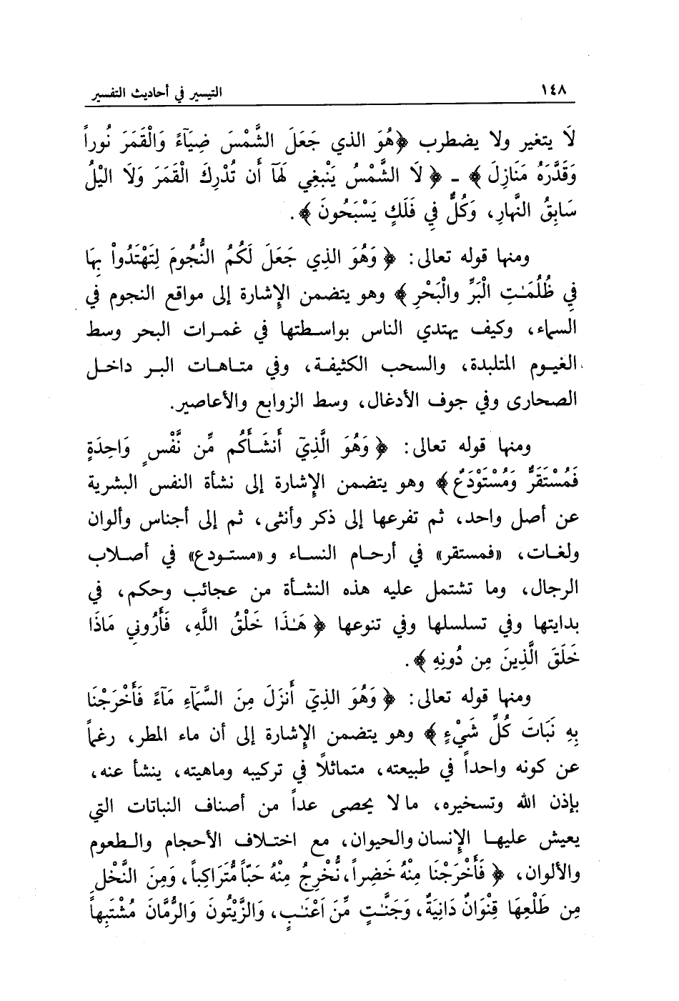 ومنها قوله تعالى: {وَهُوَ الَّذِي جَعَلَ لَكُمُ النُّجُومَ لِتَهْتَدُوا بِهَا فِي ظُلُمَاتِ الْبَرِّ وَالْبَحْرِ} وهو يتضمن الإشارة إلى مواقع النجوم في السماء، وكيف يهتدي الناس بواسطتها في غمرات البحر وسط الغيوم المتلبدة، والسحب الكثيفة، وفي متاهات البر داخل الصحارى وفي جوف الأدغال، وسط الزوابع والأعاصير.