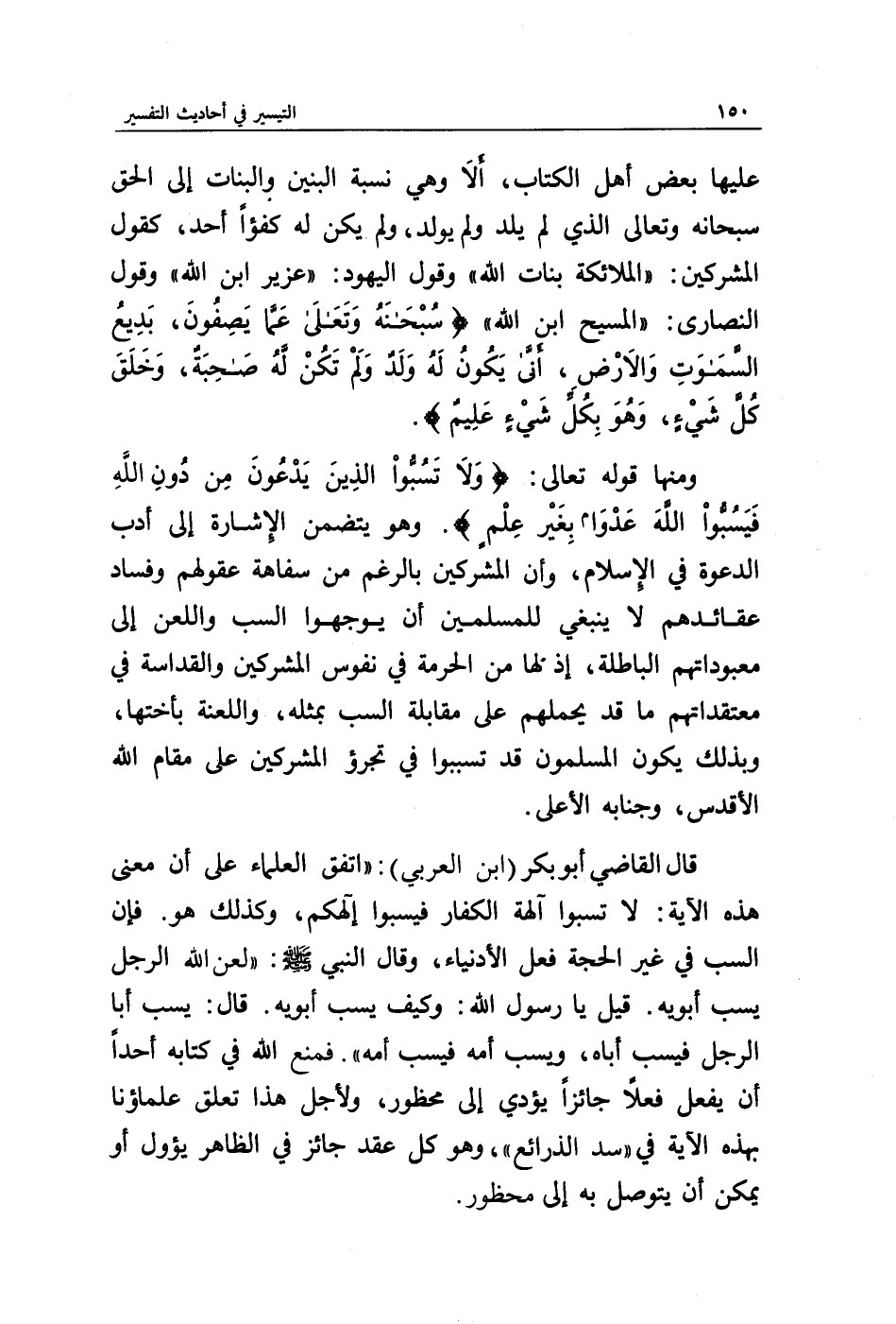 قال القاضي أبو بكر " ابن العربي ": " اتفق العلماء على أن معنى هذه الآية: لا تسبوا آلهة الكفار فيسبوا إلهكم، وكذلك هو. فإن السب في غير الحجة فعل الأدنياء، وقال النبي صلى الله عليه وسلم: (لعن الله الرجل الذي يسب والديه. قيل يا رسول الله: وكيف يسب والديه. قال: يسب أبا الرجل فيسب أباه، ويسب أمه فيسب أمه). فمنع الله في كتابه أحدا أن يفعل فعلا جائزا يؤدي إلى محظور، ولأجل هذا تعلق علماؤنا بهذه الآية في " سد الذرائع "، وهو كل عقد جائز في الظاهر يؤول أو يمكن أن يتوصل به إلى محظور.