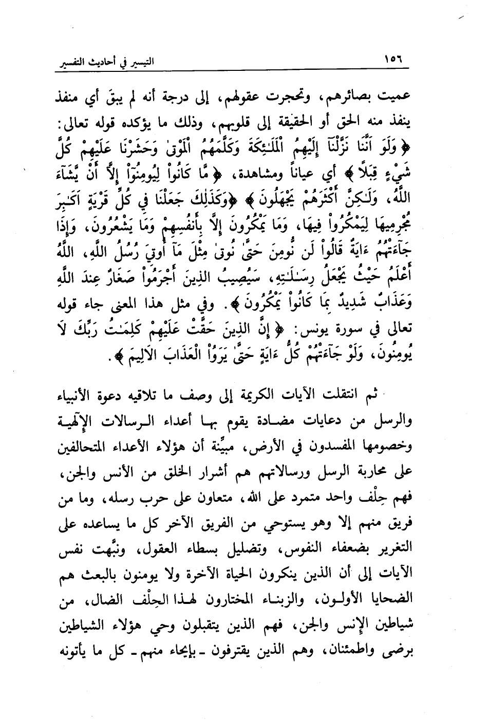 ثم انتقلت الآيات الكريمة إلى وصف ما تلاقيه دعوة الأنبياء والرسل من دعايات مضادة يقوم بها أعداء الرسالات الإلهية وخصومها المفسدون في الأرض، مبينة أن هؤلاء الأعداء المتحالفين على محاربة الرسل ورسالاتهم هم أشرار الخلق من الإنس والجن، فهم حلف واحد متمرد على الله، متعاون على حرب رسله، وما من فريق منهم إلا هو يستوحي من الفريق الآخر كل ما يساعده على التغرير بضعفاء النفوس، وتضليل بسطاء العقول، ونبهت نفس الآيات إلى أن الذين ينكرون الحياة الآخرة ولا يؤمنون بالبعث هم الضحايا الأولون، والزبناء المختارون لهذا الحلف الضال، من شياطين الإنس والجن، فهم الذين يتقبلون وحي هؤلاء الشياطين برضى واطمئنان، وهم الذين يقترفون- بإيحاء منهم- كل ما يأتونه