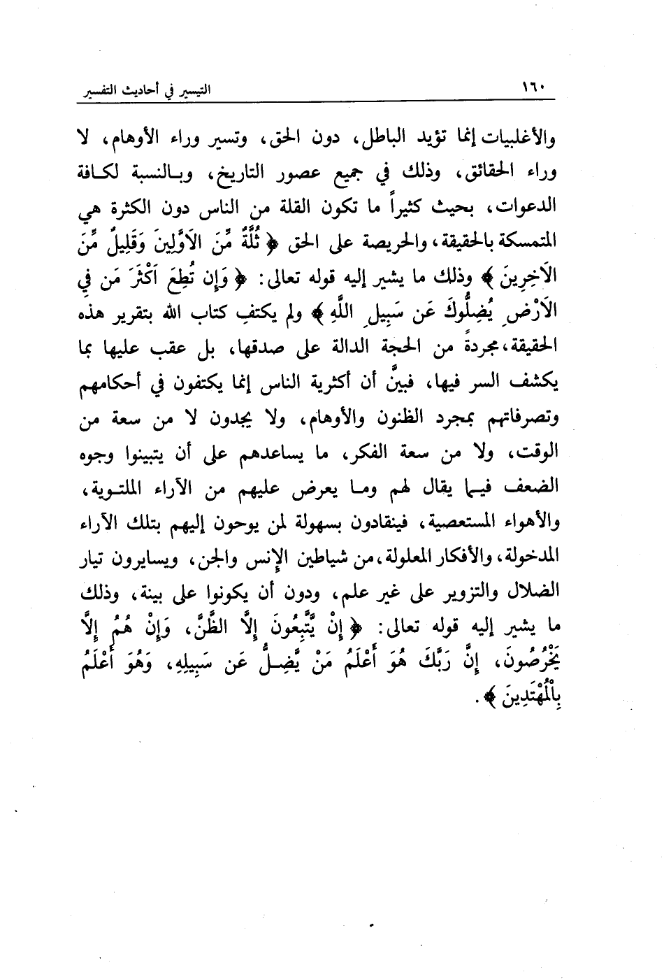 والأغلبيات إنما تؤيد الباطل، دون الحق، وتسير وراء الأوهام، لا وراء الحقائق، وذلك في جميع عصور التاريخ، وبالنسبة لكافة الدعوات، بحيث كثيرا ما تكون القلة من الناس دون الكثرة هي المتمسكة بالحقيقة، والحريصة على الحق {ثُلَّةٌ مِنَ الْأَوَّلِينَ * وَقَلِيلٌ مِنَ الْآخِرِينَ} وذلك ما يشير إليه قوله تعالى: {وَإِنْ تُطِعْ أَكْثَرَ مَنْ فِي الْأَرْضِ يُضِلُّوكَ عَنْ سَبِيلِ اللَّهِ} ولم يكتف كتاب الله بتقرير هذه الحقيقة، مجردة من الحجة الدالة على صدقها، بل عقب عليها بما يكشف السر فيها، فبين أن أكثرية الناس إنما يكتفون في أحكامهم وتصرفاتهم بمجرد الظنون والأوهام، ولا يجدون لا من سعة من الوقت، ولا من سعة الفكر، ما يساعدهم على أن يتبينوا وجوه الضعف فيما يقال لهم وما يعرض عليهم من الآراء الملتوية، والأهواء المستعصية، فينقادون بسهولة لمن يوحون إليهم بتلك الآراء المدخولة، والأفكار المعلولة، من شياطين الإنس والجن، ويسايرون تيار الضلال والتزوير على غير علم، ودون أن يكونوا على بينة، وذلك ما يشير إليه قوله تعالى: {إِنْ يَتَّبِعُونَ إِلَّا الظَّنَّ وَإِنْ هُمْ إِلَّا يَخْرُصُونَ * إِنَّ رَبَّكَ هُوَ أَعْلَمُ مَنْ يَضِلُّ عَنْ سَبِيلِهِ وَهُوَ أَعْلَمُ بِالْمُهْتَدِينَ}.