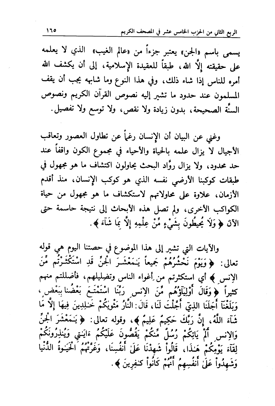 والآيات التي تشير إلى هذا الموضوع في حصتنا اليوم هي قوله تعالى: {وَيَوْمَ يَحْشُرُهُمْ جَمِيعًا يَا مَعْشَرَ الْجِنِّ قَدِ اسْتَكْثَرْتُمْ مِنَ الْإِنْسِ} أي استكثرتم من إغواء الناس وتضليلهم، فأضللتم منهم كثيرا {وَقَالَ أَوْلِيَاؤُهُمْ مِنَ الْإِنْسِ رَبَّنَا اسْتَمْتَعَ بَعْضُنَا بِبَعْضٍ وَبَلَغْنَا أَجَلَنَا الَّذِي أَجَّلْتَ لَنَا قَالَ النَّارُ مَثْوَاكُمْ خَالِدِينَ فِيهَا إِلَّا مَا شَاءَ اللَّهُ إِنَّ رَبَّكَ حَكِيمٌ عَلِيمٌ}، وقوله تعالى: {يَا مَعْشَرَ الْجِنِّ وَالْإِنْسِ أَلَمْ يَأْتِكُمْ رُسُلٌ مِنْكُمْ يَقُصُّونَ عَلَيْكُمْ آيَاتِي وَيُنْذِرُونَكُمْ لِقَاءَ يَوْمِكُمْ هَذَا قَالُوا شَهِدْنَا عَلَى أَنْفُسِنَا وَغَرَّتْهُمُ الْحَيَاةُ الدُّنْيَا وَشَهِدُوا عَلَى أَنْفُسِهِمْ أَنَّهُمْ كَانُوا كَافِرِينَ}.