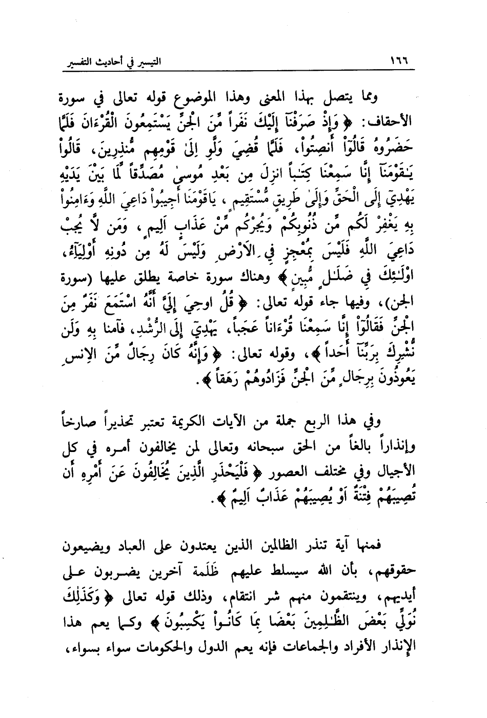 ومما يتصل بهذا المعنى وهذا الموضوع قوله تعالى في سورة الأحقاف: {وَإِذْ صَرَفْنَا إِلَيْكَ نَفَرًا مِنَ الْجِنِّ يَسْتَمِعُونَ الْقُرْآنَ فَلَمَّا حَضَرُوهُ قَالُوا أَنْصِتُوا فَلَمَّا قُضِيَ وَلَّوْا إِلَى قَوْمِهِمْ مُنْذِرِينَ * قَالُوا يَا قَوْمَنَا إِنَّا سَمِعْنَا كِتَابًا أُنْزِلَ مِنْ بَعْدِ مُوسَى مُصَدِّقًا لِمَا بَيْنَ يَدَيْهِ يَهْدِي إِلَى الْحَقِّ وَإِلَى طَرِيقٍ مُسْتَقِيمٍ * يَا قَوْمَنَا أَجِيبُوا دَاعِيَ اللَّهِ وَآمِنُوا بِهِ يَغْفِرْ لَكُمْ مِنْ ذُنُوبِكُمْ وَيُجِرْكُمْ مِنْ عَذَابٍ أَلِيمٍ * وَمَنْ لَا يُجِبْ دَاعِيَ اللَّهِ فَلَيْسَ بِمُعْجِزٍ فِي الْأَرْضِ وَلَيْسَ لَهُ مِنْ دُونِهِ أَوْلِيَاءُ أُولَئِكَ فِي ضَلَالٍ مُبِينٍ} وهناك سورة خاصة يطلق عليها " سورة الجن "، وفيها جاء قوله تعالى: {قُلْ أُوحِيَ إِلَيَّ أَنَّهُ اسْتَمَعَ نَفَرٌ مِنَ الْجِنِّ فَقَالُوا إِنَّا سَمِعْنَا قُرْآنًا عَجَبًا (1) يَهْدِي إِلَى الرُّشْدِ فَآمَنَّا بِهِ وَلَنْ نُشْرِكَ بِرَبِّنَا أَحَدًا}، وقوله تعالى {وَأَنَّهُ كَانَ رِجَالٌ مِنَ الْإِنْسِ يَعُوذُونَ بِرِجَالٍ مِنَ الْجِنِّ فَزَادُوهُمْ رَهَقًا}.
