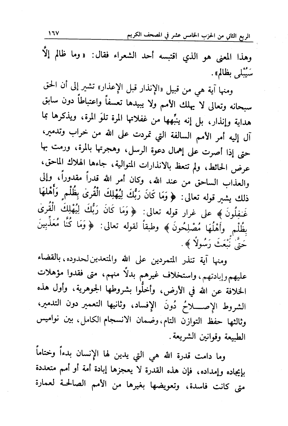 ومنها آية تنذر المتمردين على الله والمتعدين لحدوده، بالقضاء عليهم وإبادتهم، واستخلاف غيرهم بدلا منهم، متى فقدوا مؤهلات الخلافة عن الله في الأرض، وأخلوا بشروطها الجوهرية، وأول هذه الشروط الإصلاح دون الإفساد، وثانيها التعمير دون التدمير، وثالثها حفظ التوازن التام، وضمان الانسجام الكامل، بين نواميس الطبيعة وقوانين الشريعة.