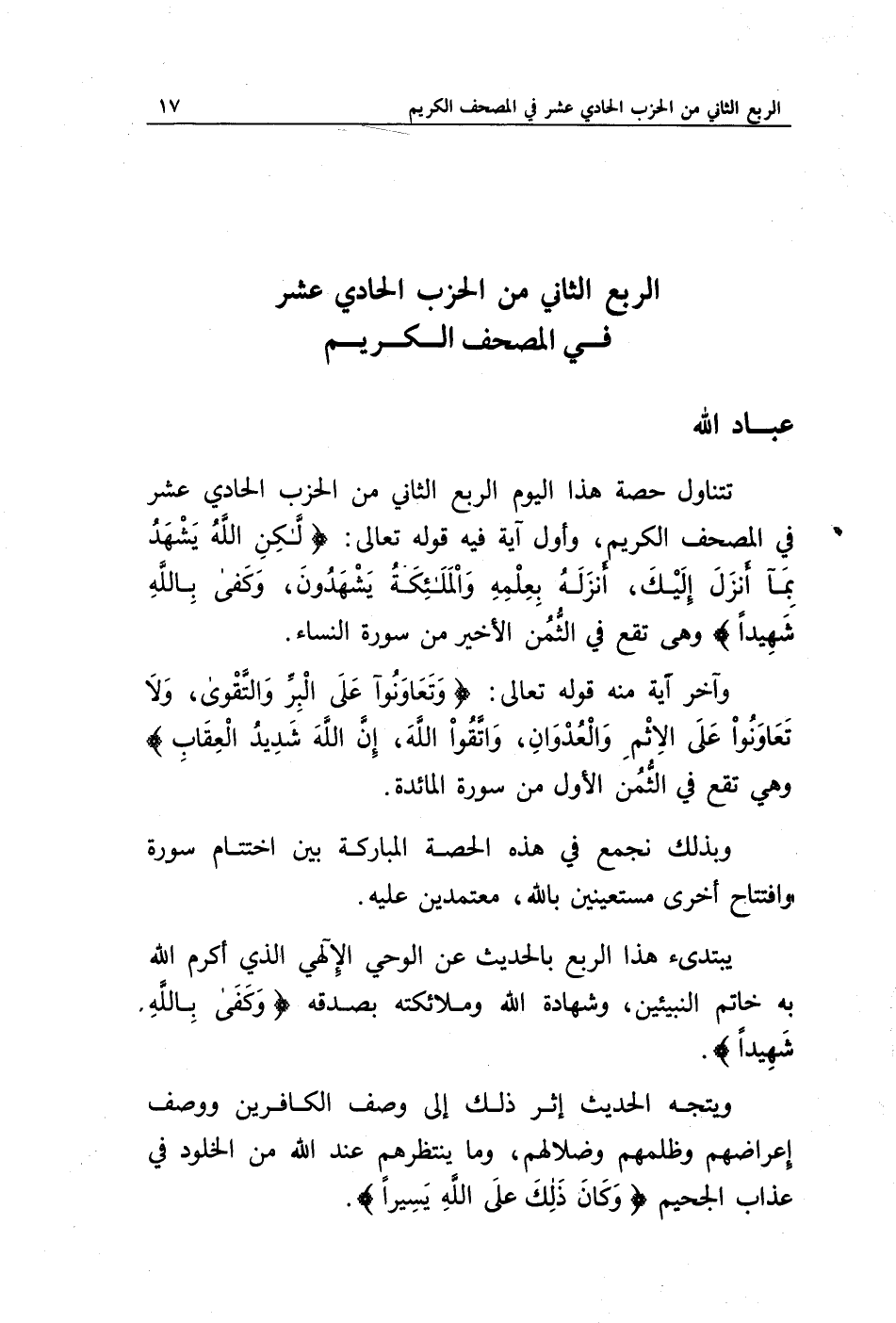 تتناول حصة هذا اليوم الربع الثاني من الحزب الحادي عشر في المصحف الكريم، وأول آية فيه قوله تعالى: {لَكِنِ اللَّهُ يَشْهَدُ بِمَا أَنْزَلَ إِلَيْكَ أَنْزَلَهُ بِعِلْمِهِ وَالْمَلَائِكَةُ يَشْهَدُونَ وَكَفَى بِاللَّهِ شَهِيدًا} وهي تقع في الثمن الأخير من سورة النساء.