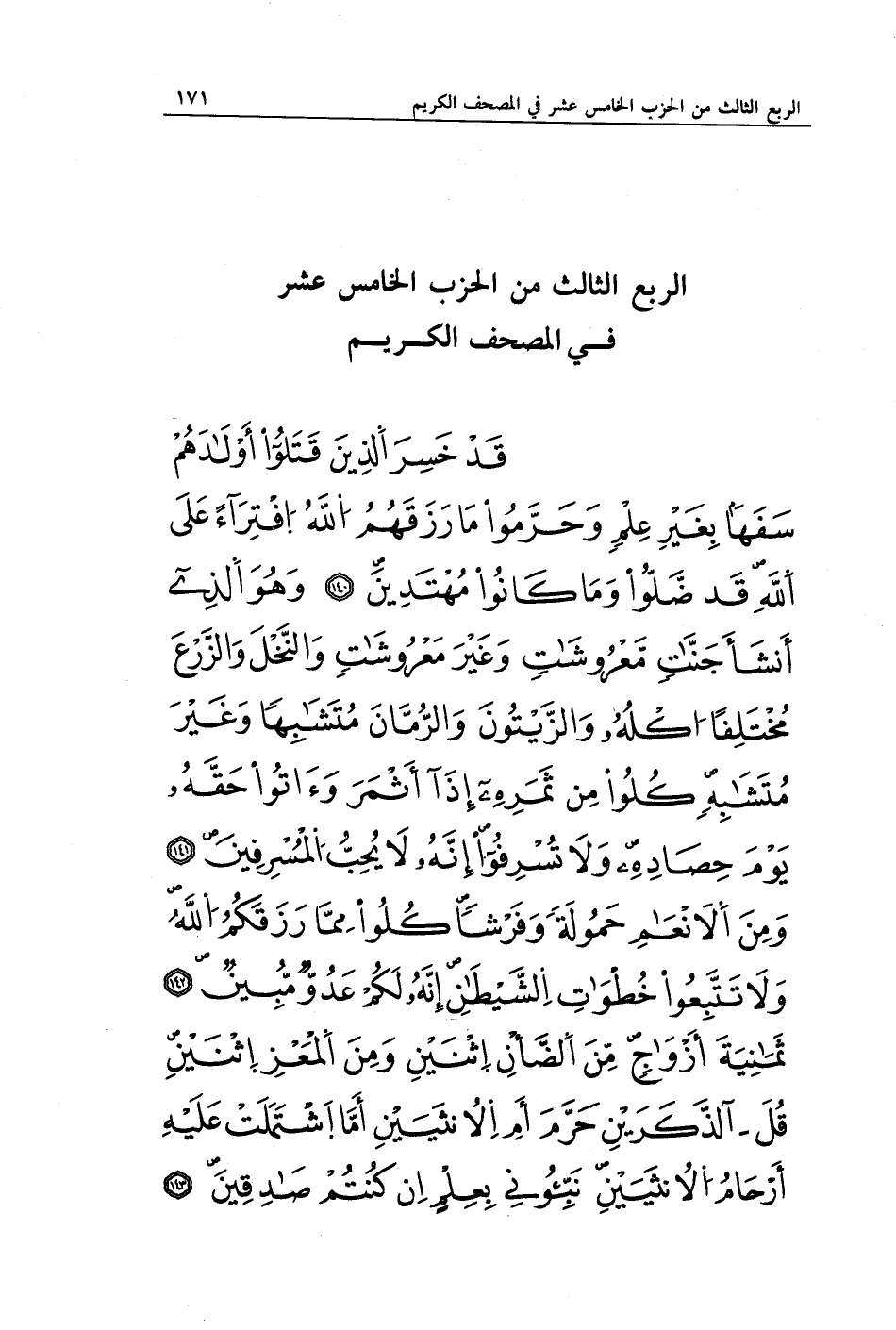 قَدْ خَسِرَ الَّذِينَ قَتَلُوا أَوْلَادَهُمْ سَفَهًا بِغَيْرِ عِلْمٍ وَحَرَّمُوا مَا رَزَقَهُمُ اللَّهُ افْتِرَاءً عَلَى اللَّهِ قَدْ ضَلُّوا وَمَا كَانُوا مُهْتَدِينَ (140) وَهُوَ الَّذِي أَنْشَأَ جَنَّاتٍ مَعْرُوشَاتٍ وَغَيْرَ مَعْرُوشَاتٍ وَالنَّخْلَ وَالزَّرْعَ مُخْتَلِفًا أُكُلُهُ وَالزَّيْتُونَ وَالرُّمَّانَ مُتَشَابِهًا وَغَيْرَ مُتَشَابِهٍ كُلُوا مِنْ ثَمَرِهِ إِذَا أَثْمَرَ وَآتُوا حَقَّهُ يَوْمَ حَصَادِهِ وَلَا تُسْرِفُوا إِنَّهُ لَا يُحِبُّ الْمُسْرِفِينَ (141) وَمِنَ الْأَنْعَامِ حَمُولَةً وَفَرْشًا كُلُوا مِمَّا رَزَقَكُمُ اللَّهُ وَلَا تَتَّبِعُوا خُطُوَاتِ الشَّيْطَانِ إِنَّهُ لَكُمْ عَدُوٌّ مُبِينٌ (142) ثَمَانِيَةَ أَزْوَاجٍ مِنَ الضَّأْنِ اثْنَيْنِ وَمِنَ الْمَعْزِ اثْنَيْنِ قُلْ آلذَّكَرَيْنِ حَرَّمَ أَمِ الْأُنْثَيَيْنِ أَمَّا اشْتَمَلَتْ عَلَيْهِ أَرْحَامُ الْأُنْثَيَيْنِ نَبِّئُونِي بِعِلْمٍ إِنْ كُنْتُمْ صَادِقِينَ (143)