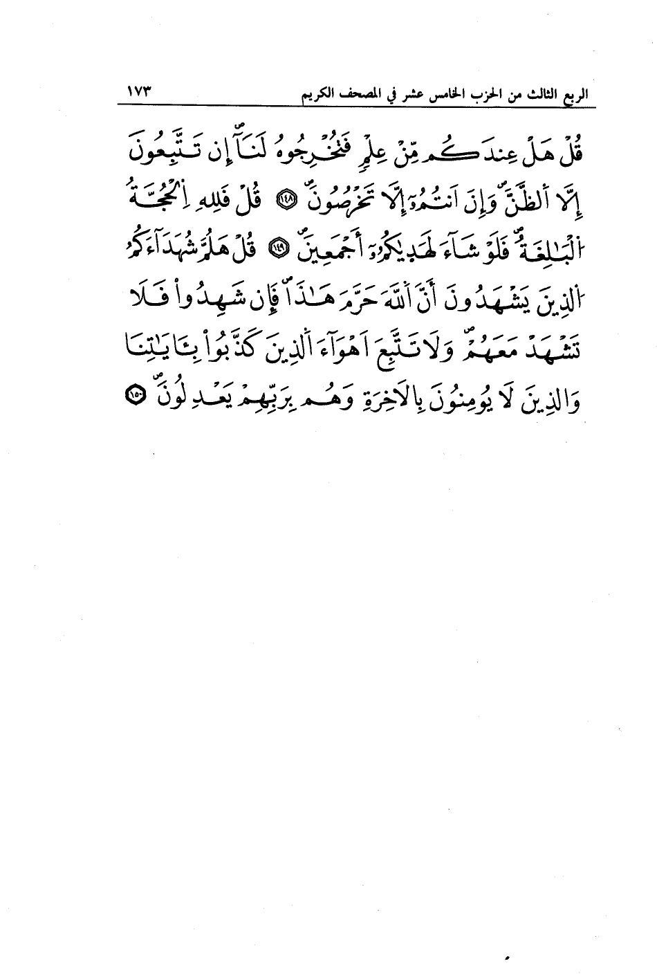 قُلْ هَلْ عِنْدَكُمْ مِنْ عِلْمٍ فَتُخْرِجُوهُ لَنَا إِنْ تَتَّبِعُونَ إِلَّا الظَّنَّ وَإِنْ أَنْتُمْ إِلَّا تَخْرُصُونَ (148) قُلْ فَلِلَّهِ الْحُجَّةُ الْبَالِغَةُ فَلَوْ شَاءَ لَهَدَاكُمْ أَجْمَعِينَ (149) قُلْ هَلُمَّ شُهَدَاءَكُمُ الَّذِينَ يَشْهَدُونَ أَنَّ اللَّهَ حَرَّمَ هَذَا فَإِنْ شَهِدُوا فَلَا تَشْهَدْ مَعَهُمْ وَلَا تَتَّبِعْ أَهْوَاءَ الَّذِينَ كَذَّبُوا بِآيَاتِنَا وَالَّذِينَ لَا يُؤْمِنُونَ بِالْآخِرَةِ وَهُمْ بِرَبِّهِمْ يَعْدِلُونَ (150)