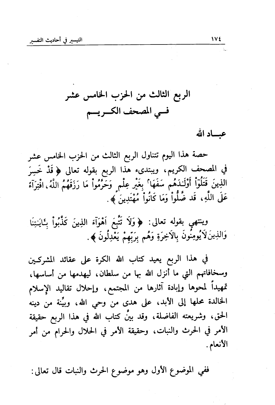 حصة هذا اليوم تتناول الربع الثالث من الحزب الخامس عشر في المصحف الكريم، ويبتدىء هذا الربع بقوله تعالى: {قَدْ خَسِرَ الَّذِينَ قَتَلُوا أَوْلَادَهُمْ سَفَهًا بِغَيْرِ عِلْمٍ وَحَرَّمُوا مَا رَزَقَهُمُ اللَّهُ افْتِرَاءً عَلَى اللَّهِ قَدْ ضَلُّوا وَمَا كَانُوا مُهْتَدِينَ}.