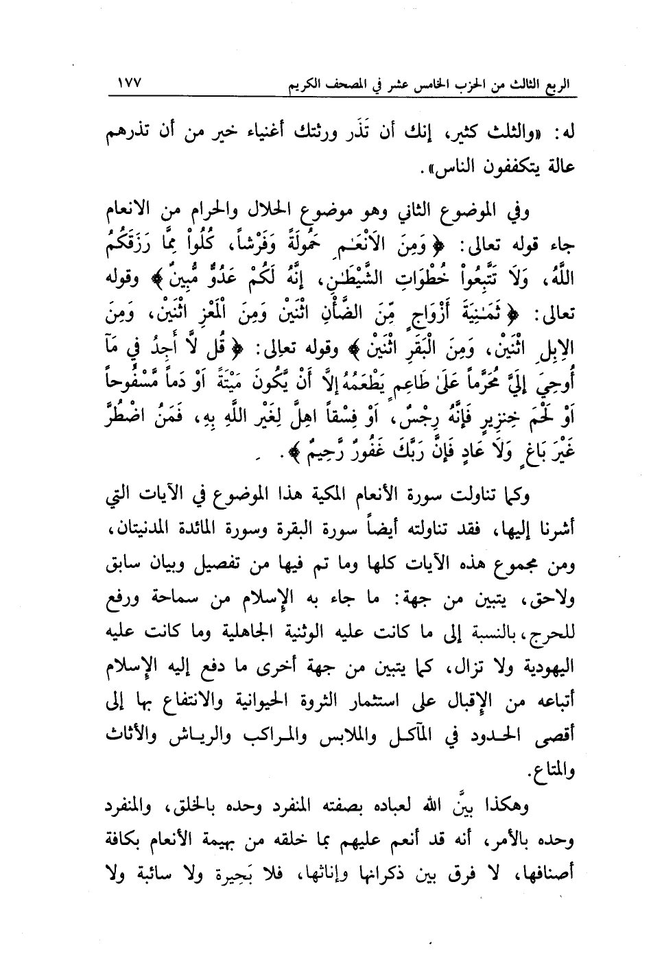 وكما تناولت سورة الأنعام المكية هذا الموضوع في الآيات التي أشرنا إليها، فقد تناولته أيضا سورة البقرة وسورة المائدة المدنيتان، ومن مجموع هذه الآيات كلها وما تم فيها من تفصيل وبيان سابق ولاحق، يتبين من جهة: ما جاء به الإسلام من سماحة ورفع للحرج، بالنسبة إلى ما كانت عليه الوثنية الجاهلية وما كانت عليه اليهودية ولا تزال، كما يتبين من جهة أخرى ما دفع إليه الإسلام أتباعه من الإقبال على استثمار الثروة الحيوانية والانتفاع بها إلى أقصى الحدود في المآكل والملابس والمراكب والرياش والأثاث والمتاع.