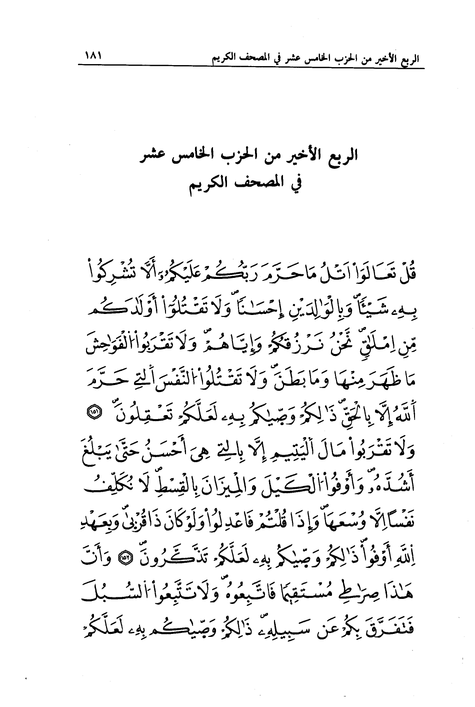 قُلْ تَعَالَوْا أَتْلُ مَا حَرَّمَ رَبُّكُمْ عَلَيْكُمْ أَلَّا تُشْرِكُوا بِهِ شَيْئًا وَبِالْوَالِدَيْنِ إِحْسَانًا وَلَا تَقْتُلُوا أَوْلَادَكُمْ مِنْ إِمْلَاقٍ نَحْنُ نَرْزُقُكُمْ وَإِيَّاهُمْ وَلَا تَقْرَبُوا الْفَوَاحِشَ مَا ظَهَرَ مِنْهَا وَمَا بَطَنَ وَلَا تَقْتُلُوا النَّفْسَ الَّتِي حَرَّمَ اللَّهُ إِلَّا بِالْحَقِّ ذَلِكُمْ وَصَّاكُمْ بِهِ لَعَلَّكُمْ تَعْقِلُونَ (151) وَلَا تَقْرَبُوا مَالَ الْيَتِيمِ إِلَّا بِالَّتِي هِيَ أَحْسَنُ حَتَّى يَبْلُغَ أَشُدَّهُ وَأَوْفُوا الْكَيْلَ وَالْمِيزَانَ بِالْقِسْطِ لَا نُكَلِّفُ نَفْسًا إِلَّا وُسْعَهَا وَإِذَا قُلْتُمْ فَاعْدِلُوا وَلَوْ كَانَ ذَا قُرْبَى وَبِعَهْدِ اللَّهِ أَوْفُوا ذَلِكُمْ وَصَّاكُمْ بِهِ لَعَلَّكُمْ تَذَكَّرُونَ (152) وَأَنَّ هَذَا صِرَاطِي مُسْتَقِيمًا فَاتَّبِعُوهُ وَلَا تَتَّبِعُوا السُّبُلَ فَتَفَرَّقَ بِكُمْ عَنْ سَبِيلِهِ ذَلِكُمْ وَصَّاكُمْ بِهِ لَعَلَّكُمْ
