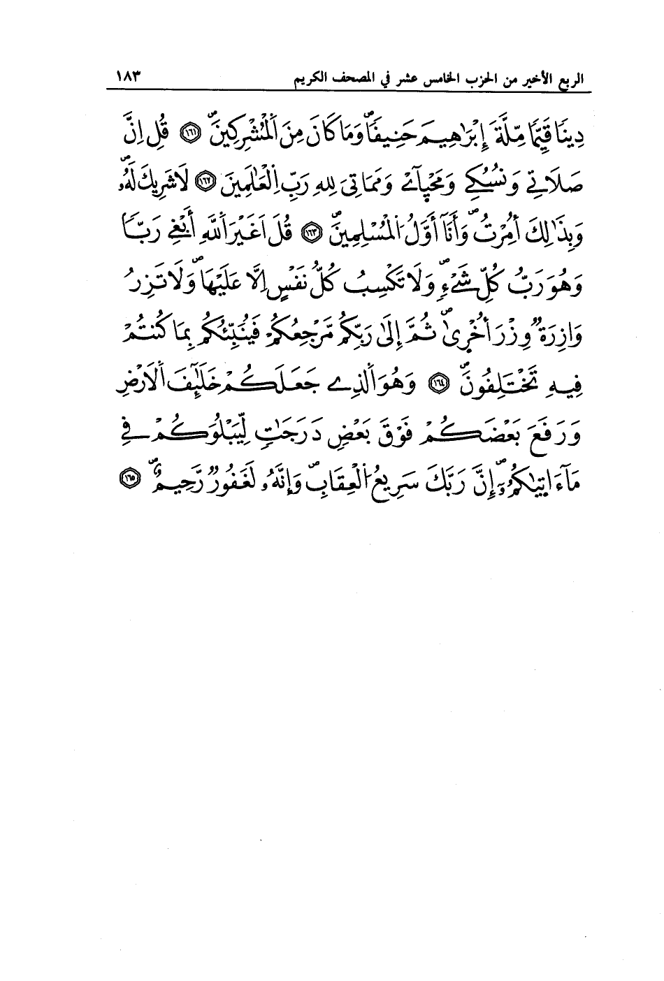 دِينًا قِيَمًا مِلَّةَ إِبْرَاهِيمَ حَنِيفًا وَمَا كَانَ مِنَ الْمُشْرِكِينَ (161) قُلْ إِنَّ صَلَاتِي وَنُسُكِي وَمَحْيَايَ وَمَمَاتِي لِلَّهِ رَبِّ الْعَالَمِينَ (162) لَا شَرِيكَ لَهُ وَبِذَلِكَ أُمِرْتُ وَأَنَا أَوَّلُ الْمُسْلِمِينَ (163) قُلْ أَغَيْرَ اللَّهِ أَبْغِي رَبًّا وَهُوَ رَبُّ كُلِّ شَيْءٍ وَلَا تَكْسِبُ كُلُّ نَفْسٍ إِلَّا عَلَيْهَا وَلَا تَزِرُ وَازِرَةٌ وِزْرَ أُخْرَى ثُمَّ إِلَى رَبِّكُمْ مَرْجِعُكُمْ فَيُنَبِّئُكُمْ بِمَا كُنْتُمْ فِيهِ تَخْتَلِفُونَ (164) وَهُوَ الَّذِي جَعَلَكُمْ خَلَائِفَ الْأَرْضِ وَرَفَعَ بَعْضَكُمْ فَوْقَ بَعْضٍ دَرَجَاتٍ لِيَبْلُوَكُمْ فِي مَا آتَاكُمْ إِنَّ رَبَّكَ سَرِيعُ الْعِقَابِ وَإِنَّهُ لَغَفُورٌ رَحِيمٌ (165)