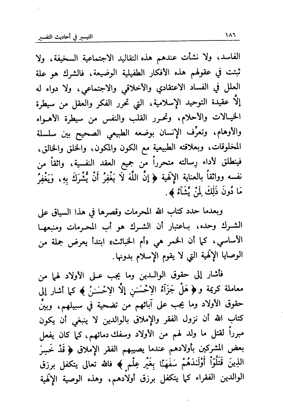 وبعدما حدد كتاب الله المحرمات وقصرها في هذا السياق على الشرك وحده، باعتبار أن الشرك هو أب المحرمات ومنبعها الأساسي، كما أن الخمر هي " أم الخبائث " ابتدأ يعرض جملة من الوصايا الإلهية التي لا يقوم الإسلام بدونها.