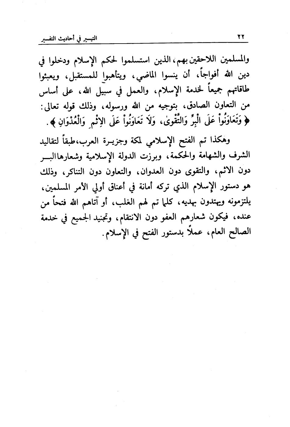 والمسلمين اللاحقين بهم، الذين استسلموا لحكم الإسلام ودخلوا في دين الله أفواجا، أن ينسوا الماضي، ويتأهبوا للمستقبل، ويبعثوا طاقاتهم جميعا لخدمة الإسلام، والعمل في سبيل الله، على أساس من التعاون الصادق، بتوجيه من الله ورسوله، وذلك قوله تعالى: {وَتَعَاوَنُوا عَلَى الْبِرِّ وَالتَّقْوَى وَلَا تَعَاوَنُوا عَلَى الْإِثْمِ وَالْعُدْوَانِ}.