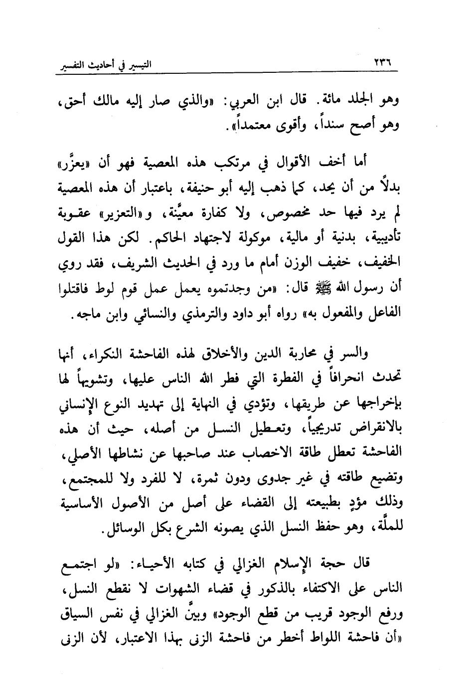 قال حجة الإسلام الغزالي في كتابه الإحياء: " لو اجتمع الناس على الاكتفاء بالذكور في قضاء الشهوات لانقطع النسل، ورفع الوجود قريب من قطع الوجود "، وبين الغزالي في نفس السياق " أن فاحشة اللواط أخطر من فاحشة الزنى بهذا الاعتبار، لأن الزنى