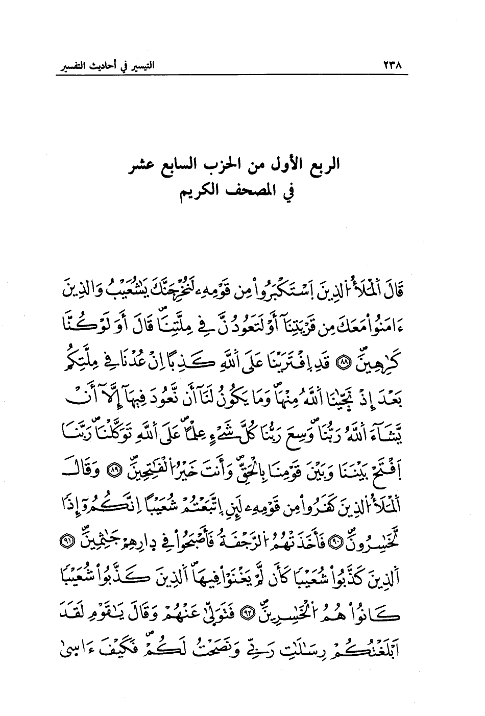 قَالَ الْمَلَأُ الَّذِينَ اسْتَكْبَرُوا مِنْ قَوْمِهِ لَنُخْرِجَنَّكَ يَا شُعَيْبُ وَالَّذِينَ آمَنُوا مَعَكَ مِنْ قَرْيَتِنَا أَوْ لَتَعُودُنَّ فِي مِلَّتِنَا قَالَ أَوَلَوْ كُنَّا كَارِهِينَ (88) قَدِ افْتَرَيْنَا عَلَى اللَّهِ كَذِبًا إِنْ عُدْنَا فِي مِلَّتِكُمْ بَعْدَ إِذْ نَجَّانَا اللَّهُ مِنْهَا وَمَا يَكُونُ لَنَا أَنْ نَعُودَ فِيهَا إِلَّا أَنْ يَشَاءَ اللَّهُ رَبُّنَا وَسِعَ رَبُّنَا كُلَّ شَيْءٍ عِلْمًا عَلَى اللَّهِ تَوَكَّلْنَا رَبَّنَا افْتَحْ بَيْنَنَا وَبَيْنَ قَوْمِنَا بِالْحَقِّ وَأَنْتَ خَيْرُ الْفَاتِحِينَ (89) وَقَالَ الْمَلَأُ الَّذِينَ كَفَرُوا مِنْ قَوْمِهِ لَئِنِ اتَّبَعْتُمْ شُعَيْبًا إِنَّكُمْ إِذًا لَخَاسِرُونَ (90) فَأَخَذَتْهُمُ الرَّجْفَةُ فَأَصْبَحُوا فِي دَارِهِمْ جَاثِمِينَ (91) الَّذِينَ كَذَّبُوا شُعَيْبًا كَأَنْ لَمْ يَغْنَوْا فِيهَا الَّذِينَ كَذَّبُوا شُعَيْبًا كَانُوا هُمُ الْخَاسِرِينَ (92) فَتَوَلَّى عَنْهُمْ وَقَالَ يَا قَوْمِ لَقَدْ أَبْلَغْتُكُمْ رِسَالَاتِ رَبِّي وَنَصَحْتُ لَكُمْ فَكَيْفَ آسَى