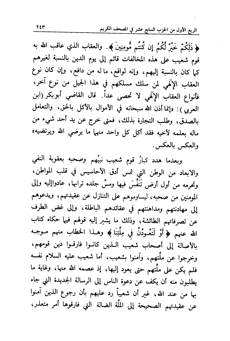 {ذَلِكُمْ خَيْرٌ لَكُمْ إِنْ كُنْتُمْ مُؤْمِنِينَ}. والعقاب الذي عاقب الله به قوم شعيب على هذه المخالفات قائم إلى يوم الدين بالنسبة لغيرهم كما كان بالنسبة إليهم، وإنه لواقع، ما له من دافع. وإذا كان نوع العقاب الإلهي لمن سلك مسلكهم في هذا الجيل من نوع آخر، فأنواع العقاب الإلهي لا تحصى عدا. قال القاضي أبو بكر ابن العربي: " إنما أذن الله سبحانه في الأموال بالأكل بالحق، والتعامل بالصدق، وطلب التجارة بذلك، فمتى خرج عن يد أحد شيء من ماله بعلمه لأخيه فقد أكل كل واحد منهما ما يرضي الله ويرتضيه " والعكس بالعكس.