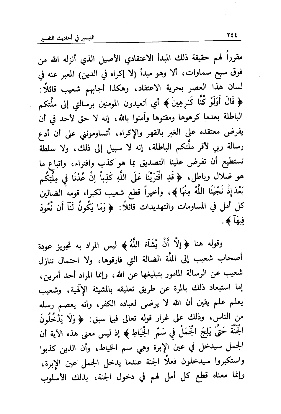 وقوله هنا {إِلَّا أَنْ يَشَاءَ اللَّهُ} ليس المراد به تجويز عودة أصحاب شعيب إلى الملة الضالة التي فارقوها، ولا احتمال تنازل شعيب عن الرسالة المأمور بتبليغها عن الله، وإنما المراد أحد أمرين، إما استبعاد ذلك بالمرة عن طريق تعليقه بالمشيئة الإلهية، وشعيب يعلم علم اليقين أن الله لا يرضى لعباده الكفر، وأنه يعصم رسله من الناس، وذلك على غرار قوله تعالى فيما سبق: {وَلَا يَدْخُلُونَ الْجَنَّةَ حَتَّى يَلِجَ الْجَمَلُ فِي سَمِّ الْخِيَاطِ} إذ ليس معنى هذه الآية أن الجمل سيدخل في عين الإبرة وهي سم الخياط، وأن الذين كذبوا واستكبروا سيدخلون فعلا الجنة عندما يدخل الجمل عين الإبرة، وإنما معناه قطع كل أمل لهم في دخول الجنة، بذلك الأسلوب