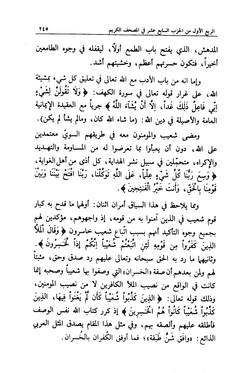 ومما يلاحظ في هذا السياق أمران اثنان: أولهما ما قدح به كبار قوم شعيب في الذين آمنوا به من قومه، إذ واجهوهم، مؤكدين لهم بجميع وجوه التأكيد أنهم بسبب اتباع شعيب خاسرون {وَقَالَ الْمَلَأُ الَّذِينَ كَفَرُوا مِنْ قَوْمِهِ لَئِنِ اتَّبَعْتُمْ شُعَيْبًا إِنَّكُمْ إِذًا لَخَاسِرُونَ}. وثانيهما ما رد به الحق سبحانه وتعالى عليهم رد صدق وحق، مثبتا لهم ولمن بعدهم أن صفة " الخسران " التي وصفوا بها شعيبا وصحبه إنما كانت في الواقع من نصيب الملأ الكافرين لا من نصيب المؤمنين، وذلك قوله تعالى: {الَّذِينَ كَذَّبُوا شُعَيْبًا كَأَنْ لَمْ يَغْنَوْا فِيهَا الَّذِينَ كَذَّبُوا شُعَيْبًا كَانُوا هُمُ الْخَاسِرِينَ} إذ كرر كتاب الله نفس الوصف فأطلقه عليهم وألصقه بهم، وفي مثل هذا المقام يصدق المثل العربي الذائع: " وافق شن طبقة "؛ فما أوفق الكفران بالخسران.