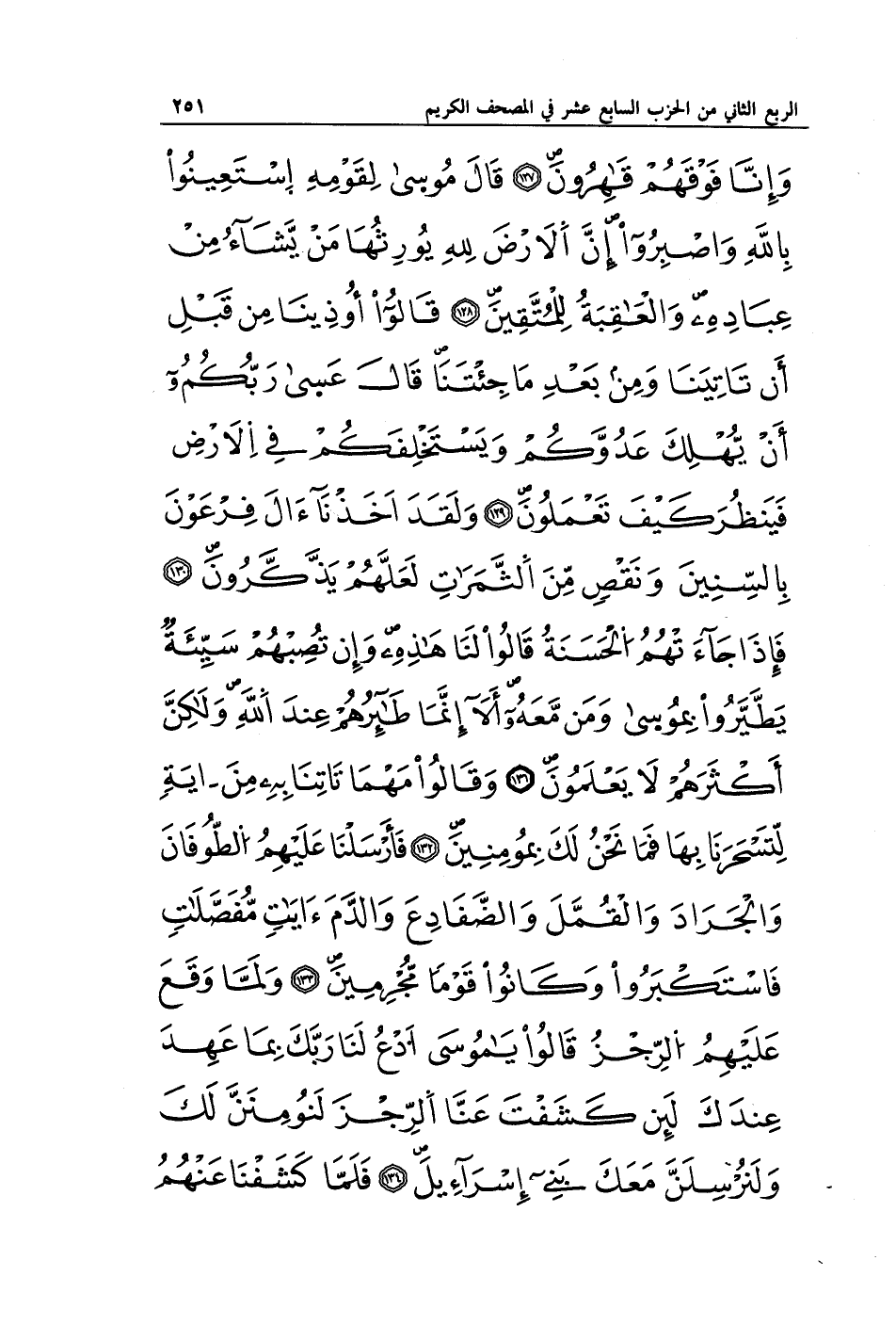 وَإِنَّا فَوْقَهُمْ قَاهِرُونَ (127) قَالَ مُوسَى لِقَوْمِهِ اسْتَعِينُوا بِاللَّهِ وَاصْبِرُوا إِنَّ الْأَرْضَ لِلَّهِ يُورِثُهَا مَنْ يَشَاءُ مِنْ عِبَادِهِ وَالْعَاقِبَةُ لِلْمُتَّقِينَ (128) قَالُوا أُوذِينَا مِنْ قَبْلِ أَنْ تَأْتِيَنَا وَمِنْ بَعْدِ مَا جِئْتَنَا قَالَ عَسَى رَبُّكُمْ أَنْ يُهْلِكَ عَدُوَّكُمْ وَيَسْتَخْلِفَكُمْ فِي الْأَرْضِ فَيَنْظُرَ كَيْفَ تَعْمَلُونَ (129) وَلَقَدْ أَخَذْنَا آلَ فِرْعَوْنَ بِالسِّنِينَ وَنَقْصٍ مِنَ الثَّمَرَاتِ لَعَلَّهُمْ يَذَّكَّرُونَ (130) فَإِذَا جَاءَتْهُمُ الْحَسَنَةُ قَالُوا لَنَا هَذِهِ وَإِنْ تُصِبْهُمْ سَيِّئَةٌ يَطَّيَّرُوا بِمُوسَى وَمَنْ مَعَهُ أَلَا إِنَّمَا طَائِرُهُمْ عِنْدَ اللَّهِ وَلَكِنَّ أَكْثَرَهُمْ لَا يَعْلَمُونَ (131) وَقَالُوا مَهْمَا تَأْتِنَا بِهِ مِنْ آيَةٍ لِتَسْحَرَنَا بِهَا فَمَا نَحْنُ لَكَ بِمُؤْمِنِينَ (132) فَأَرْسَلْنَا عَلَيْهِمُ الطُّوفَانَ وَالْجَرَادَ وَالْقُمَّلَ وَالضَّفَادِعَ وَالدَّمَ آيَاتٍ مُفَصَّلَاتٍ فَاسْتَكْبَرُوا وَكَانُوا قَوْمًا مُجْرِمِينَ (133) وَلَمَّا وَقَعَ عَلَيْهِمُ الرِّجْزُ قَالُوا يَا مُوسَى ادْعُ لَنَا رَبَّكَ بِمَا عَهِدَ عِنْدَكَ لَئِنْ كَشَفْتَ عَنَّا الرِّجْزَ لَنُؤْمِنَنَّ لَكَ وَلَنُرْسِلَنَّ مَعَكَ بَنِي إِسْرَائِيلَ (134) فَلَمَّا كَشَفْنَا عَنْهُمُ