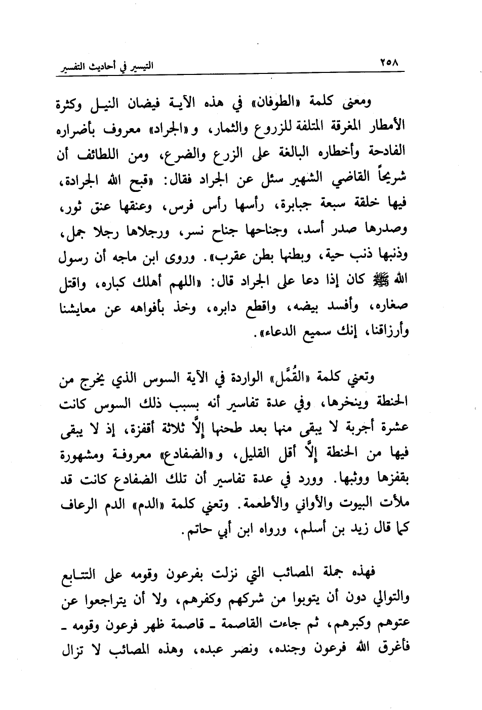 ومعنى كلمة الطوفان في هذه الآية فيضان النيل وكثرة الأمطار المغرقة المتلفة للزروع والثمار، " والجراد " معروف بأضراره الفادحة وأخطاره البالغة على الزرع والضرع، ومن اللطائف أن شريحا القاضي الشهير سئل عن الجراد فقال: " قبح الله الجرادة، فيها خلقة سبعة جبابرة، رأسها رأس فرس، وعنقها عنق ثور، وصدرها صدر أسد، وجناحها جناح نسر، ورجلها رجل جمل، وذنبها ذنب حية، وبطنها بطن عقرب ". وروى ابن ماجه أن رسول الله صلى الله عليه وسلم كان إذا دعا على الجراد قال: (اللهم أهلك كباره، واقتل صغاره، وأفسد بيضه، واقطع دابره، وخذ بأفواهه عن معايشنا وأرزاقنا، إنك سميع الدعاء).