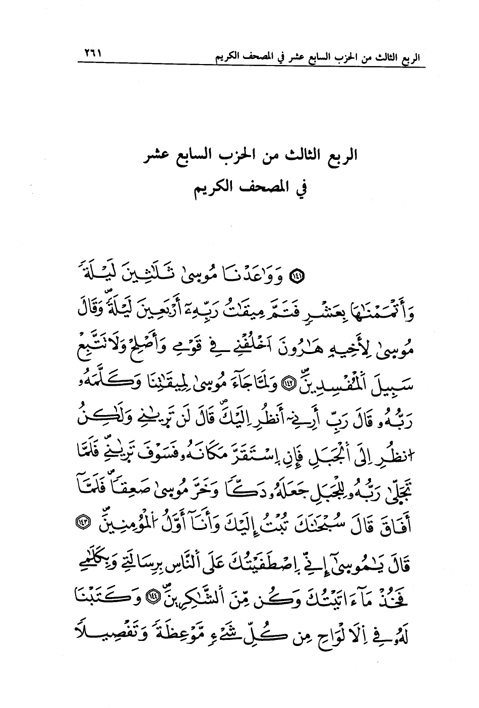 وَوَاعَدْنَا مُوسَى ثَلَاثِينَ لَيْلَةً وَأَتْمَمْنَاهَا بِعَشْرٍ فَتَمَّ مِيقَاتُ رَبِّهِ أَرْبَعِينَ لَيْلَةً وَقَالَ مُوسَى لِأَخِيهِ هَارُونَ اخْلُفْنِي فِي قَوْمِي وَأَصْلِحْ وَلَا تَتَّبِعْ سَبِيلَ الْمُفْسِدِينَ (142) وَلَمَّا جَاءَ مُوسَى لِمِيقَاتِنَا وَكَلَّمَهُ رَبُّهُ قَالَ رَبِّ أَرِنِي أَنْظُرْ إِلَيْكَ قَالَ لَنْ تَرَانِي وَلَكِنِ انْظُرْ إِلَى الْجَبَلِ فَإِنِ اسْتَقَرَّ مَكَانَهُ فَسَوْفَ تَرَانِي فَلَمَّا تَجَلَّى رَبُّهُ لِلْجَبَلِ جَعَلَهُ دَكًّا وَخَرَّ مُوسَى صَعِقًا فَلَمَّا أَفَاقَ قَالَ سُبْحَانَكَ تُبْتُ إِلَيْكَ وَأَنَا أَوَّلُ الْمُؤْمِنِينَ (143) قَالَ يَا مُوسَى إِنِّي اصْطَفَيْتُكَ عَلَى النَّاسِ بِرِسَالَاتِي وَبِكَلَامِي فَخُذْ مَا آتَيْتُكَ وَكُنْ مِنَ الشَّاكِرِينَ (144) وَكَتَبْنَا لَهُ فِي الْأَلْوَاحِ مِنْ كُلِّ شَيْءٍ مَوْعِظَةً وَتَفْصِيلًا