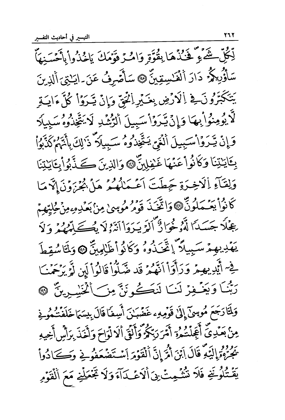 لِكُلِّ شَيْءٍ فَخُذْهَا بِقُوَّةٍ وَأْمُرْ قَوْمَكَ يَأْخُذُوا بِأَحْسَنِهَا سَأُرِيكُمْ دَارَ الْفَاسِقِينَ (145) سَأَصْرِفُ عَنْ آيَاتِيَ الَّذِينَ يَتَكَبَّرُونَ فِي الْأَرْضِ بِغَيْرِ الْحَقِّ وَإِنْ يَرَوْا كُلَّ آيَةٍ لَا يُؤْمِنُوا بِهَا وَإِنْ يَرَوْا سَبِيلَ الرُّشْدِ لَا يَتَّخِذُوهُ سَبِيلًا وَإِنْ يَرَوْا سَبِيلَ الْغَيِّ يَتَّخِذُوهُ سَبِيلًا ذَلِكَ بِأَنَّهُمْ كَذَّبُوا بِآيَاتِنَا وَكَانُوا عَنْهَا غَافِلِينَ (146) وَالَّذِينَ كَذَّبُوا بِآيَاتِنَا وَلِقَاءِ الْآخِرَةِ حَبِطَتْ أَعْمَالُهُمْ هَلْ يُجْزَوْنَ إِلَّا مَا كَانُوا يَعْمَلُونَ (147) وَاتَّخَذَ قَوْمُ مُوسَى مِنْ بَعْدِهِ مِنْ حُلِيِّهِمْ عِجْلًا جَسَدًا لَهُ خُوَارٌ أَلَمْ يَرَوْا أَنَّهُ لَا يُكَلِّمُهُمْ وَلَا يَهْدِيهِمْ سَبِيلًا اتَّخَذُوهُ وَكَانُوا ظَالِمِينَ (148) وَلَمَّا سُقِطَ فِي أَيْدِيهِمْ وَرَأَوْا أَنَّهُمْ قَدْ ضَلُّوا قَالُوا لَئِنْ لَمْ يَرْحَمْنَا رَبُّنَا وَيَغْفِرْ لَنَا لَنَكُونَنَّ مِنَ الْخَاسِرِينَ (149) وَلَمَّا رَجَعَ مُوسَى إِلَى قَوْمِهِ غَضْبَانَ أَسِفًا قَالَ بِئْسَمَا خَلَفْتُمُونِي مِنْ بَعْدِي أَعَجِلْتُمْ أَمْرَ رَبِّكُمْ وَأَلْقَى الْأَلْوَاحَ وَأَخَذَ بِرَأْسِ أَخِيهِ يَجُرُّهُ إِلَيْهِ قَالَ ابْنَ أُمَّ إِنَّ الْقَوْمَ اسْتَضْعَفُونِي وَكَادُوا يَقْتُلُونَنِي فَلَا تُشْمِتْ بِيَ الْأَعْدَاءَ وَلَا تَجْعَلْنِي مَعَ الْقَوْمِ