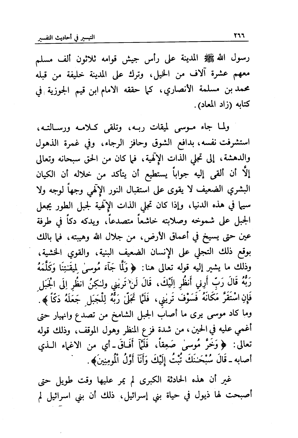 ولما جاء موسى لميقات ربه، وتلقى كلامه ورسالته، استشرفت نفسه، بدافع الشوق وحافز الرجاء، وفي غمرة الذهول والدهشة، إلى تجلي الذات الإلهية، فما كان من الحق سبحانه وتعالى إلا أن ألقى جوابا يستطيع أن يتأكد من خلاله أن الكيان البشري الضعيف لا يقوى على استقبال النور الإلهي وجها لوجه ولاسيما في هذه الدنيا، وإذا كان تجلي الذات الإلهية لجبل الطور يجعل الجبل على شموخه وصلابته خاشعا متصدعا، ويدكه دكا في طرفة عين حتى يسيخ في أعماق الأرض، من جلال الله وهيبته، فما بالك بوقع ذلك التجلي على الإنسان الضعيف البنية، والقوي الخشية، وذلك ما يشير إليه قوله تعالى هنا: {وَلَمَّا جَاءَ مُوسَى لِمِيقَاتِنَا وَكَلَّمَهُ رَبُّهُ قَالَ رَبِّ أَرِنِي أَنْظُرْ إِلَيْكَ قَالَ لَنْ تَرَانِي وَلَكِنِ انْظُرْ إِلَى الْجَبَلِ فَإِنِ اسْتَقَرَّ مَكَانَهُ فَسَوْفَ تَرَانِي فَلَمَّا تَجَلَّى رَبُّهُ لِلْجَبَلِ جَعَلَهُ دَكًّا}. وما كاد موسى يرى ما أصاب الجبل الشامخ من تصدع وانهيار حتى أغمي عليه في الحين، من شدة فزع المنظر وهول الموقف، وذلك قوله تعالى: {وَخَرَّ مُوسَى صَعِقًا فَلَمَّا أَفَاقَ} - أي من الإغماء الذي أصابه - {قَالَ سُبْحَانَكَ تُبْتُ إِلَيْكَ وَأَنَا أَوَّلُ الْمُؤْمِنِينَ}.