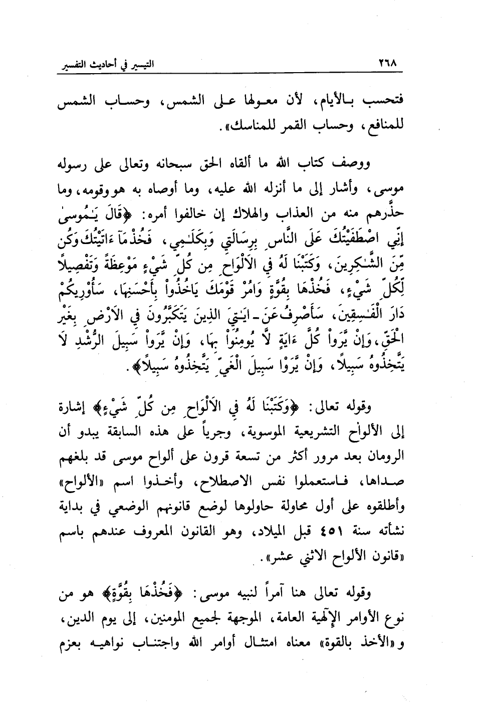 ووصف كتاب الله ما ألقاه الحق سبحانه وتعالى على رسوله موسى، وأشار إلى ما أنزله عليه، وما أوصاه به هو وقومه، وما حذرهم منه من العذاب والهلاك إن خالفوا أمره: {قَالَ يَا مُوسَى إِنِّي اصْطَفَيْتُكَ عَلَى النَّاسِ بِرِسَالَاتِي وَبِكَلَامِي فَخُذْ مَا آتَيْتُكَ وَكُنْ مِنَ الشَّاكِرِينَ * وَكَتَبْنَا لَهُ فِي الْأَلْوَاحِ مِنْ كُلِّ شَيْءٍ مَوْعِظَةً وَتَفْصِيلًا لِكُلِّ شَيْءٍ فَخُذْهَا بِقُوَّةٍ وَأْمُرْ قَوْمَكَ يَأْخُذُوا بِأَحْسَنِهَا سَأُرِيكُمْ دَارَ الْفَاسِقِينَ * سَأَصْرِفُ عَنْ آيَاتِيَ الَّذِينَ يَتَكَبَّرُونَ فِي الْأَرْضِ بِغَيْرِ الْحَقِّ وَإِنْ يَرَوْا كُلَّ آيَةٍ لَا يُؤْمِنُوا بِهَا وَإِنْ يَرَوْا سَبِيلَ الرُّشْدِ لَا يَتَّخِذُوهُ سَبِيلًا}.