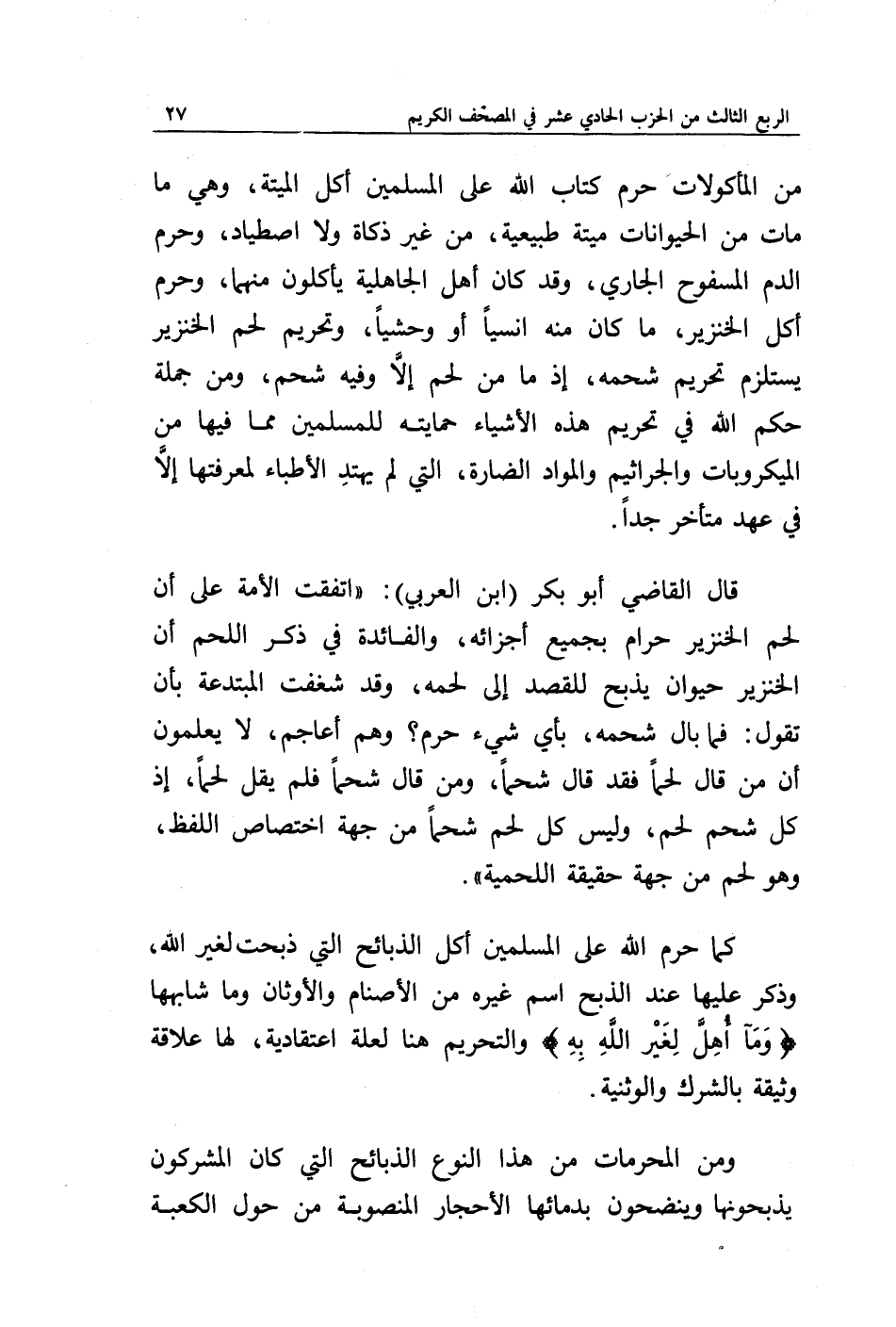 من المأكولات حرم كتاب الله على المسلمين أكل الميتة، وهي ما مات من الحيوانات ميتة طبيعية، من غير ذكاة ولا اصطياد، وحرم الدم المسفوح الجاري، وقد كان أهل الجاهلية يأكلون منهما، وحرم أكل الخنزير، ما كان منه انسيا أو وحشيا، وتحريم لحم الخنزير يستلزم تحريم شحمه، إذ ما من لحم إلا فيه شحم، ومن جملة حكم الله في تحريم هذه الأشياء حمايته للمسلمين مما فيها من الميكروبات والجراثيم والمواد الضارة، التي لم يهتد الأطباء لمعرفتها إلا في عهد متأخر جدا.