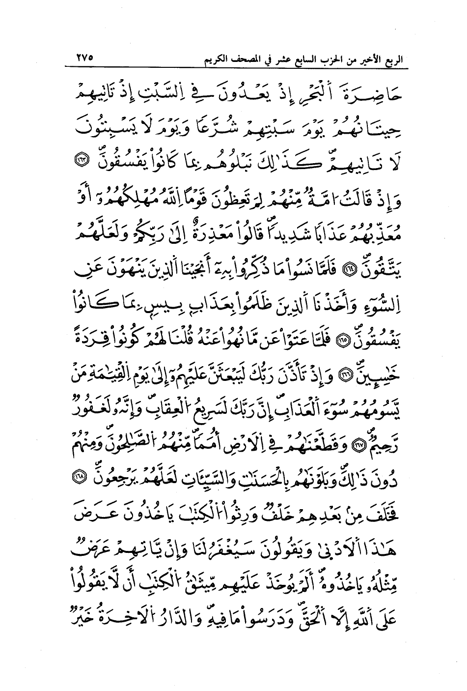 حَاضِرَةَ الْبَحْرِ إِذْ يَعْدُونَ فِي السَّبْتِ إِذْ تَأْتِيهِمْ حِيتَانُهُمْ يَوْمَ سَبْتِهِمْ شُرَّعًا وَيَوْمَ لَا يَسْبِتُونَ لَا تَأْتِيهِمْ كَذَلِكَ نَبْلُوهُمْ بِمَا كَانُوا يَفْسُقُونَ (163) وَإِذْ قَالَتْ أُمَّةٌ مِنْهُمْ لِمَ تَعِظُونَ قَوْمًا اللَّهُ مُهْلِكُهُمْ أَوْ مُعَذِّبُهُمْ عَذَابًا شَدِيدًا قَالُوا مَعْذِرَةً إِلَى رَبِّكُمْ وَلَعَلَّهُمْ يَتَّقُونَ (164) فَلَمَّا نَسُوا مَا ذُكِّرُوا بِهِ أَنْجَيْنَا الَّذِينَ يَنْهَوْنَ عَنِ السُّوءِ وَأَخَذْنَا الَّذِينَ ظَلَمُوا بِعَذَابٍ بَئِيسٍ بِمَا كَانُوا يَفْسُقُونَ (165) فَلَمَّا عَتَوْا عَنْ مَا نُهُوا عَنْهُ قُلْنَا لَهُمْ كُونُوا قِرَدَةً خَاسِئِينَ (166) وَإِذْ تَأَذَّنَ رَبُّكَ لَيَبْعَثَنَّ عَلَيْهِمْ إِلَى يَوْمِ الْقِيَامَةِ مَنْ يَسُومُهُمْ سُوءَ الْعَذَابِ إِنَّ رَبَّكَ لَسَرِيعُ الْعِقَابِ وَإِنَّهُ لَغَفُورٌ رَحِيمٌ (167) وَقَطَّعْنَاهُمْ فِي الْأَرْضِ أُمَمًا مِنْهُمُ الصَّالِحُونَ وَمِنْهُمْ دُونَ ذَلِكَ وَبَلَوْنَاهُمْ بِالْحَسَنَاتِ وَالسَّيِّئَاتِ لَعَلَّهُمْ يَرْجِعُونَ (168) فَخَلَفَ مِنْ بَعْدِهِمْ خَلْفٌ وَرِثُوا الْكِتَابَ يَأْخُذُونَ عَرَضَ هَذَا الْأَدْنَى وَيَقُولُونَ سَيُغْفَرُ لَنَا وَإِنْ يَأْتِهِمْ عَرَضٌ مِثْلُهُ يَأْخُذُوهُ أَلَمْ يُؤْخَذْ عَلَيْهِمْ مِيثَاقُ الْكِتَابِ أَنْ لَا يَقُولُوا عَلَى اللَّهِ إِلَّا الْحَقَّ وَدَرَسُوا مَا فِيهِ وَالدَّارُ الْآخِرَةُ خَيْرٌ