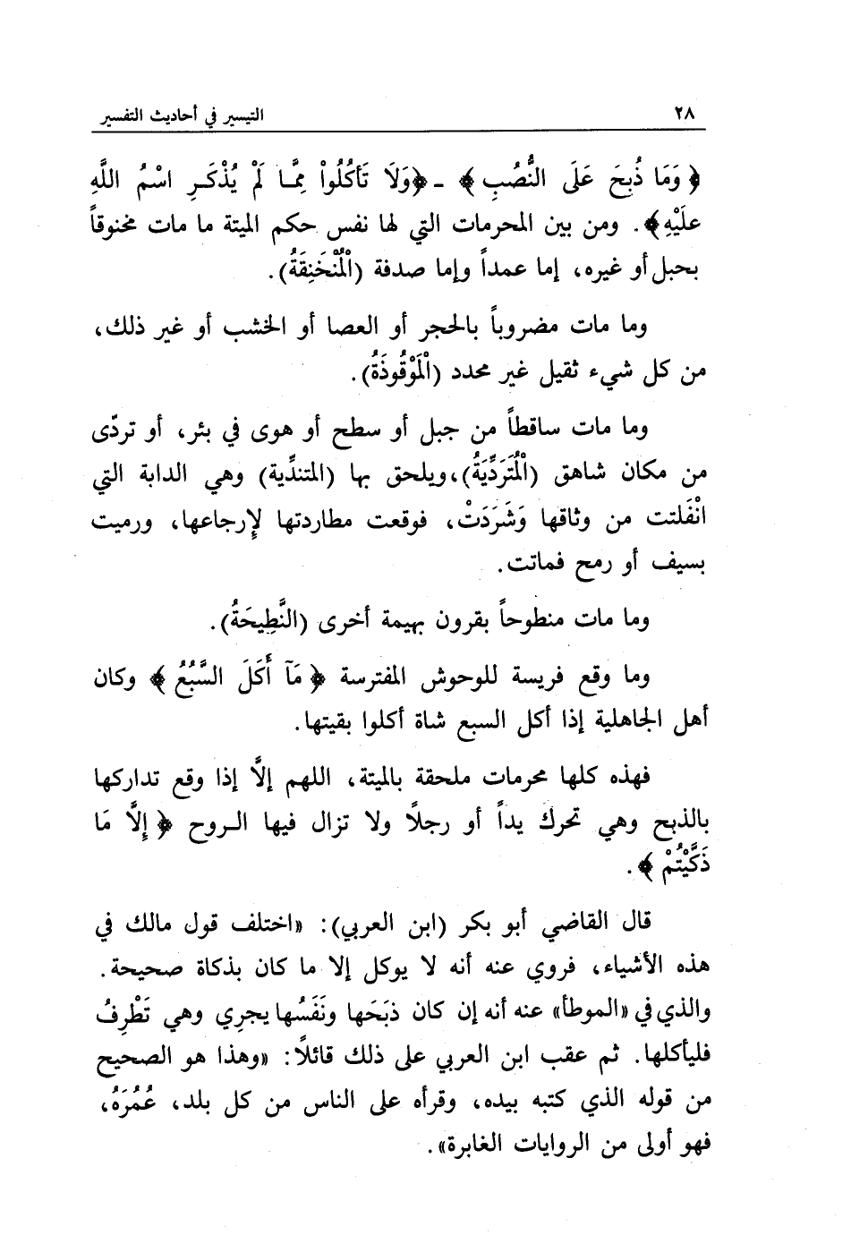 قال القاضي أبو بكر (ابن العربي): (اختلف قول مالك في هذه الأشياء، فروي عنه أنه لا يوكل إلا ما كان بذكاة صحيحة. والذي في (الموطأ) عنه أنه إن كان ذبحها ونفسها يجري وهي تطرف فليأكلها. ثم عقب ابن العربي على ذلك قائلا: (وهذا هو الصحيح من قوله الذي كتبه بيده، وقرأه على الناس من كل بلد، عمره، فهو أولى من الروايات الغابرة).