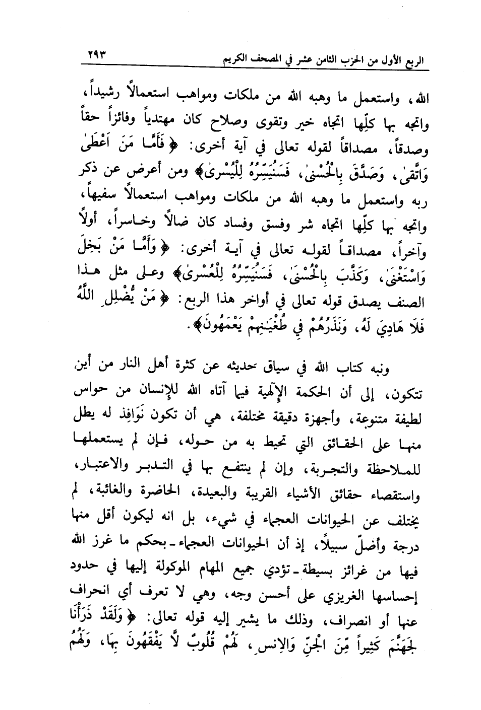 الله واستعمل ما وهبه الله من ملكات ومواهب استعمالا رشيدا، واتجه بها كلها اتجاه خير وتقوى وصلاح كان مهتديا وفائزا حقا وصدقا، مصداقا لقوله تعالى في آية أخرى: {فَأَمَّا مَنْ أَعْطَى وَاتَّقَى * وَصَدَّقَ بِالْحُسْنَى * فَسَنُيَسِّرُهُ لِلْيُسْرَى} ومن أعرض عن ذكر ربه واستعمل ما وهبه الله من ملكات ومواهب استعمالا سفيها، واتجه بها كلها اتجاه شر وفسق وفساد كان ضالا وخاسرا، أولا وآخرا، مصداقا لقوله تعالى في آية أخرى: {وَأَمَّا مَنْ بَخِلَ وَاسْتَغْنَى * وَكَذَّبَ بِالْحُسْنَى * فَسَنُيَسِّرُهُ لِلْعُسْرَى} وعلى مثل هذا الصنف يصدق قوله تعالى في أواخر هذا الربع: {مَنْ يُضْلِلِ اللَّهُ فَلَا هَادِيَ لَهُ وَيَذَرُهُمْ فِي طُغْيَانِهِمْ يَعْمَهُونَ}.