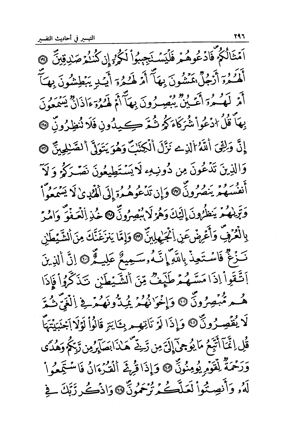 أَمْثَالُكُمْ فَادْعُوهُمْ فَلْيَسْتَجِيبُوا لَكُمْ إِنْ كُنْتُمْ صَادِقِينَ (194) أَلَهُمْ أَرْجُلٌ يَمْشُونَ بِهَا أَمْ لَهُمْ أَيْدٍ يَبْطِشُونَ بِهَا أَمْ لَهُمْ أَعْيُنٌ يُبْصِرُونَ بِهَا أَمْ لَهُمْ آذَانٌ يَسْمَعُونَ بِهَا قُلِ ادْعُوا شُرَكَاءَكُمْ ثُمَّ كِيدُونِ فَلَا تُنْظِرُونِ (195) إِنَّ وَلِيِّيَ اللَّهُ الَّذِي نَزَّلَ الْكِتَابَ وَهُوَ يَتَوَلَّى الصَّالِحِينَ (196) وَالَّذِينَ تَدْعُونَ مِنْ دُونِهِ لَا يَسْتَطِيعُونَ نَصْرَكُمْ وَلَا أَنْفُسَهُمْ يَنْصُرُونَ (197) وَإِنْ تَدْعُوهُمْ إِلَى الْهُدَى لَا يَسْمَعُوا وَتَرَاهُمْ يَنْظُرُونَ إِلَيْكَ وَهُمْ لَا يُبْصِرُونَ (198) خُذِ الْعَفْوَ وَأْمُرْ بِالْعُرْفِ وَأَعْرِضْ عَنِ الْجَاهِلِينَ (199) وَإِمَّا يَنْزَغَنَّكَ مِنَ الشَّيْطَانِ نَزْغٌ فَاسْتَعِذْ بِاللَّهِ إِنَّهُ سَمِيعٌ عَلِيمٌ (200) إِنَّ الَّذِينَ اتَّقَوْا إِذَا مَسَّهُمْ طَائِفٌ مِنَ الشَّيْطَانِ تَذَكَّرُوا فَإِذَا هُمْ مُبْصِرُونَ (201) وَإِخْوَانُهُمْ يَمُدُّونَهُمْ فِي الْغَيِّ ثُمَّ لَا يُقْصِرُونَ (202) وَإِذَا لَمْ تَأْتِهِمْ بِآيَةٍ قَالُوا لَوْلَا اجْتَبَيْتَهَا قُلْ إِنَّمَا أَتَّبِعُ مَا يُوحَى إِلَيَّ مِنْ رَبِّي هَذَا بَصَائِرُ مِنْ رَبِّكُمْ وَهُدًى وَرَحْمَةٌ لِقَوْمٍ يُؤْمِنُونَ (203) وَإِذَا قُرِئَ الْقُرْآنُ فَاسْتَمِعُوا لَهُ وَأَنْصِتُوا لَعَلَّكُمْ تُرْحَمُونَ (204) وَاذْكُرْ رَبَّكَ فِي