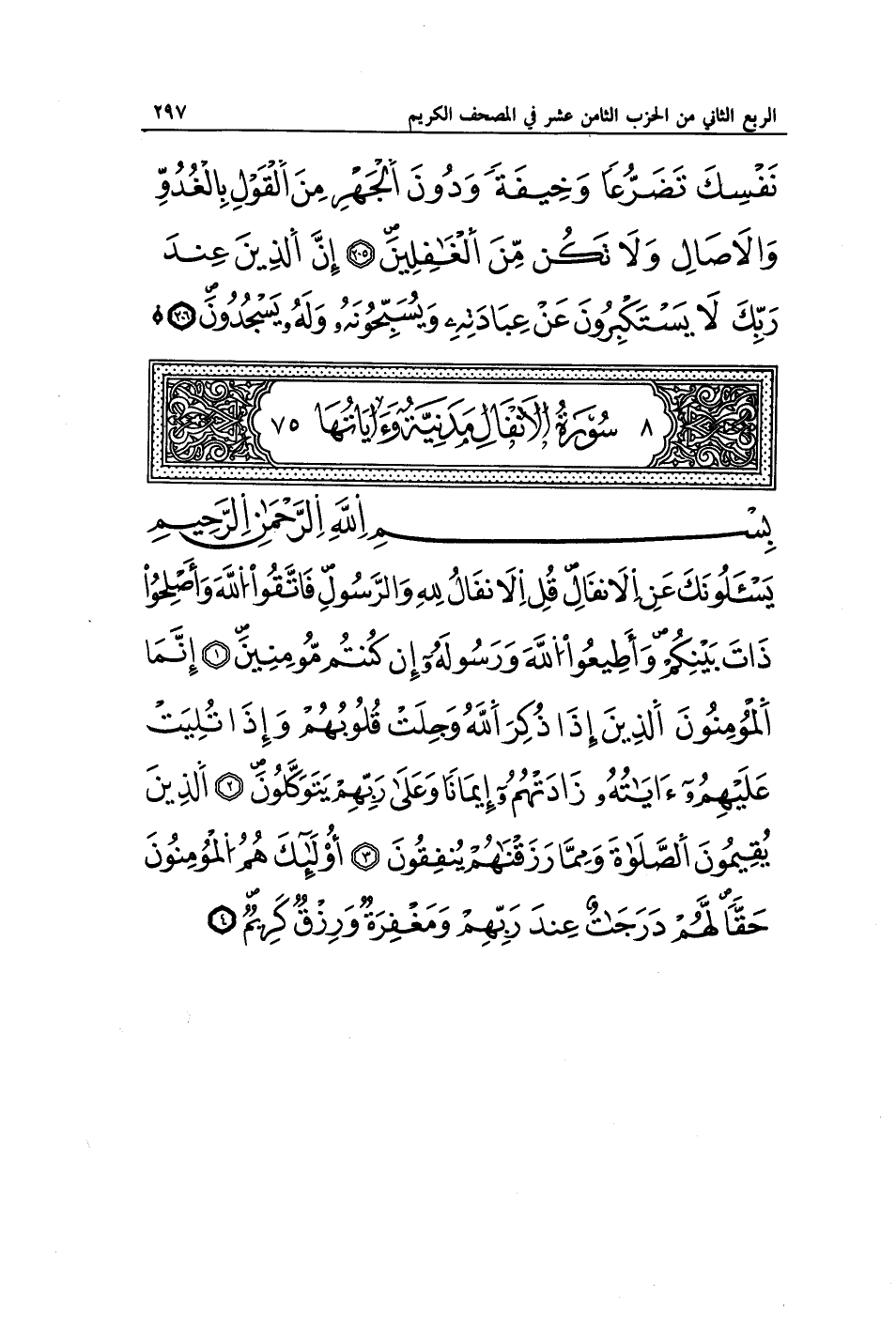 يَسْأَلُونَكَ عَنِ الْأَنْفَالِ قُلِ الْأَنْفَالُ لِلَّهِ وَالرَّسُولِ فَاتَّقُوا اللَّهَ وَأَصْلِحُوا ذَاتَ بَيْنِكُمْ وَأَطِيعُوا اللَّهَ وَرَسُولَهُ إِنْ كُنْتُمْ مُؤْمِنِينَ (1) إِنَّمَا الْمُؤْمِنُونَ الَّذِينَ إِذَا ذُكِرَ اللَّهُ وَجِلَتْ قُلُوبُهُمْ وَإِذَا تُلِيَتْ عَلَيْهِمْ آيَاتُهُ زَادَتْهُمْ إِيمَانًا وَعَلَى رَبِّهِمْ يَتَوَكَّلُونَ (2) الَّذِينَ يُقِيمُونَ الصَّلَاةَ وَمِمَّا رَزَقْنَاهُمْ يُنْفِقُونَ (3) أُولَئِكَ هُمُ الْمُؤْمِنُونَ حَقًّا لَهُمْ دَرَجَاتٌ عِنْدَ رَبِّهِمْ وَمَغْفِرَةٌ وَرِزْقٌ كَرِيمٌ (4)